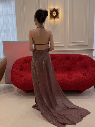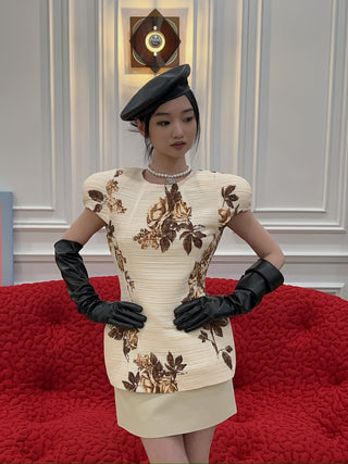 BLUMARINE - Long Viscose Georgette Dress with Rose and Ruffles in Amber/Bubble