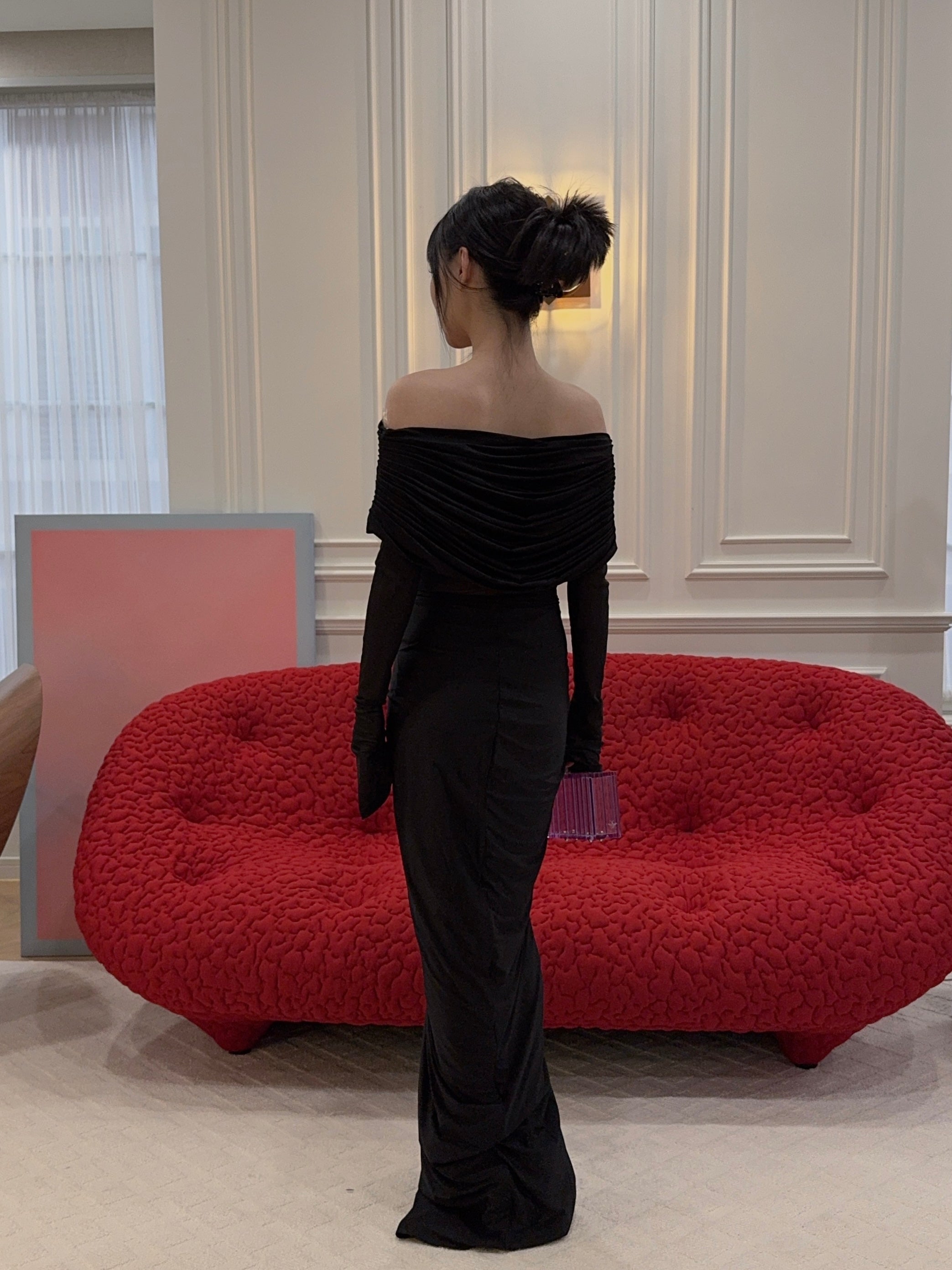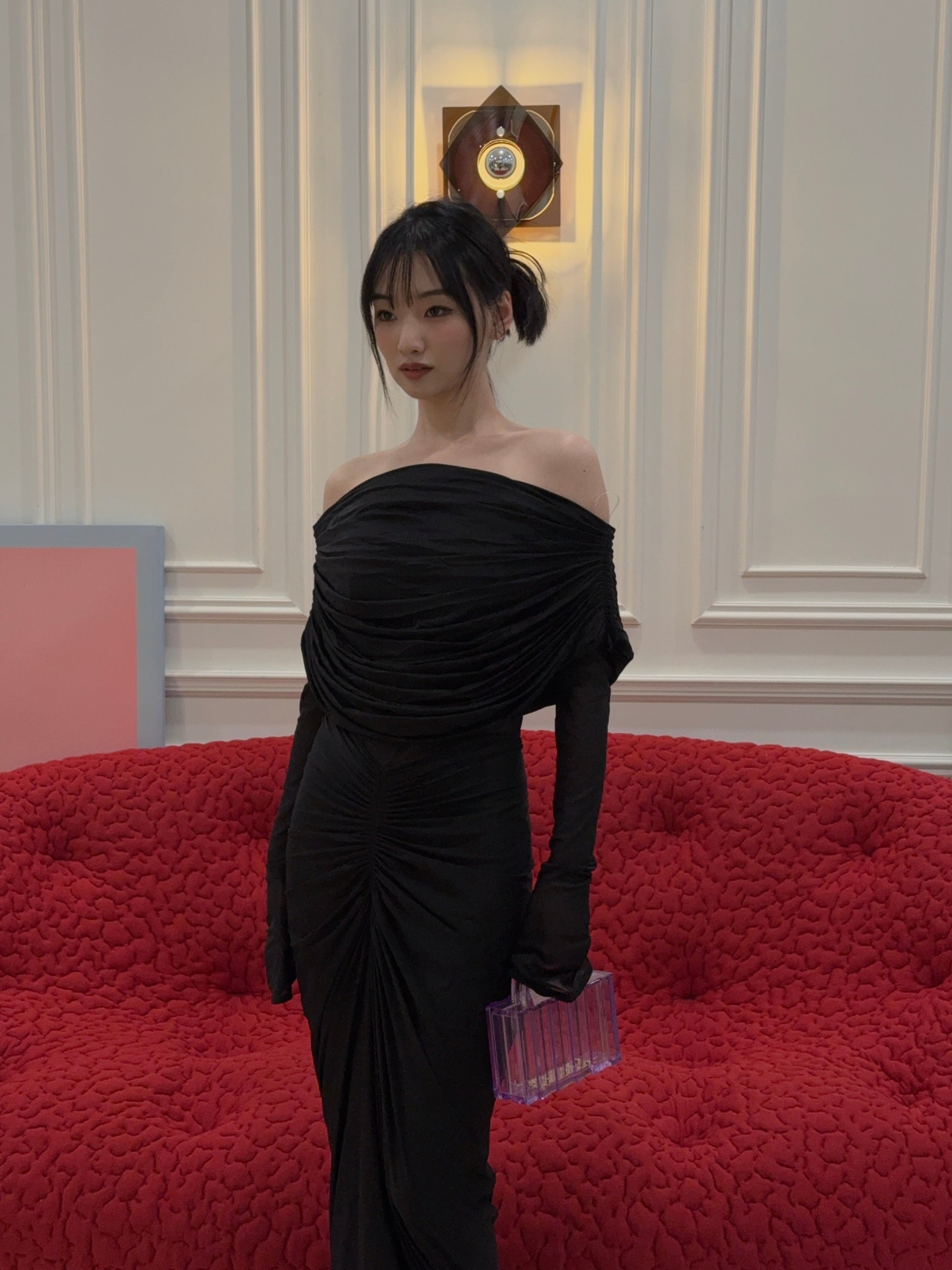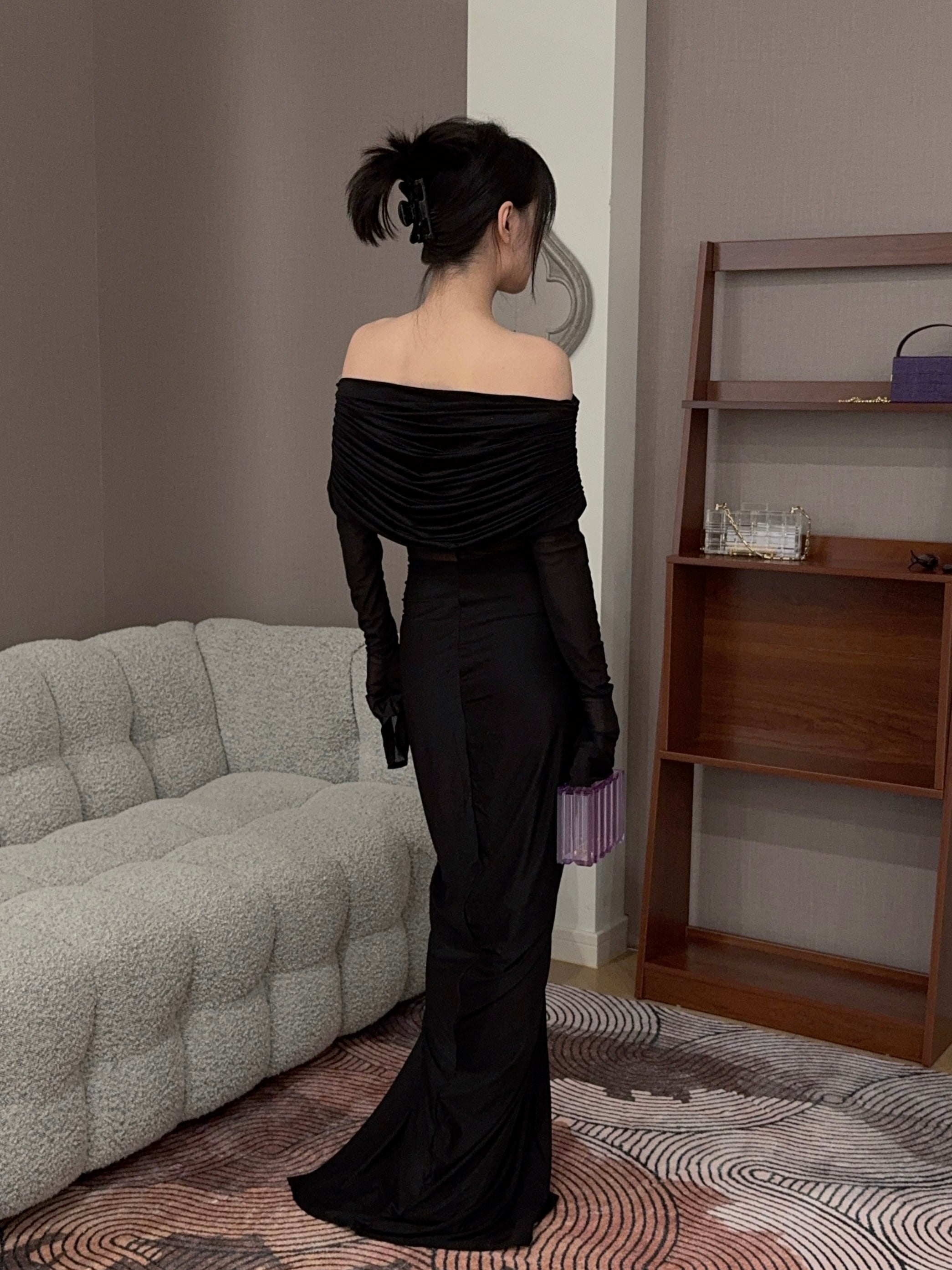 The design seamlessly blends a tube-coupled top with a modern aesthetic, striking the perfect balance between classic and contemporary. The see-through waist introduces an element of subtle allure, allowing a tasteful glimpse of skin while maintaining sophistication. The gathered center bottom artfully accentuates the waist, creating a flattering and dynamic silhouette.