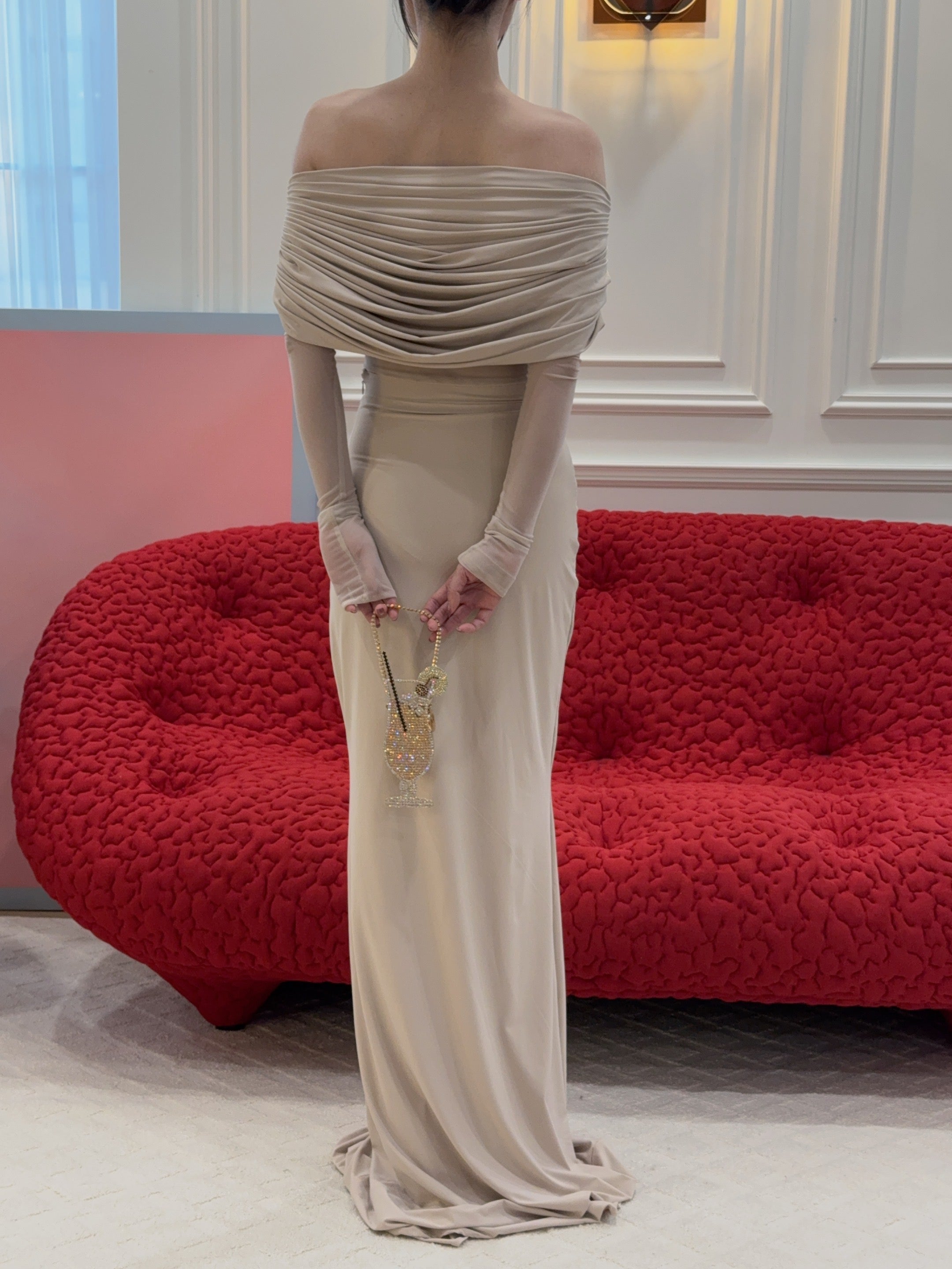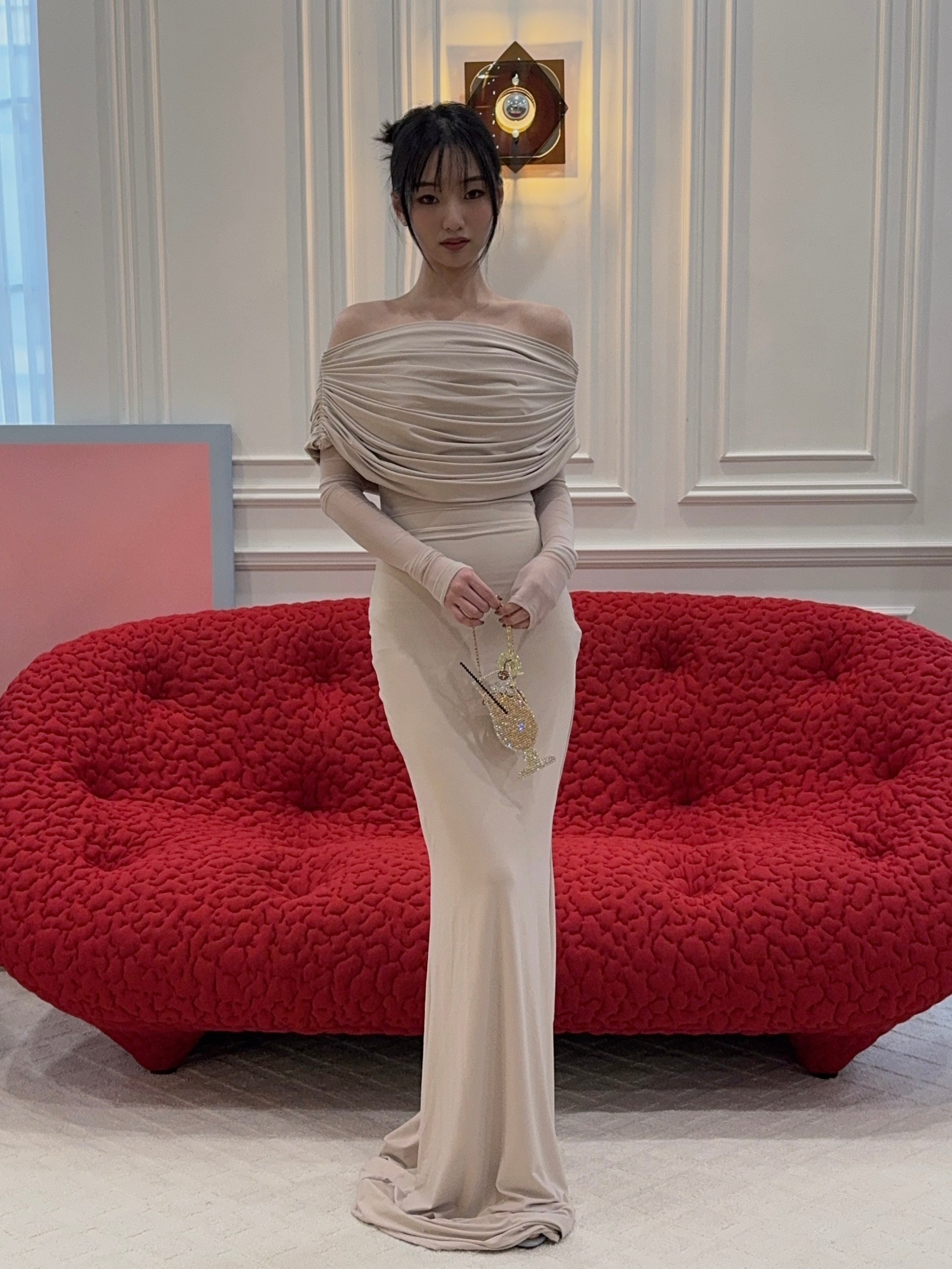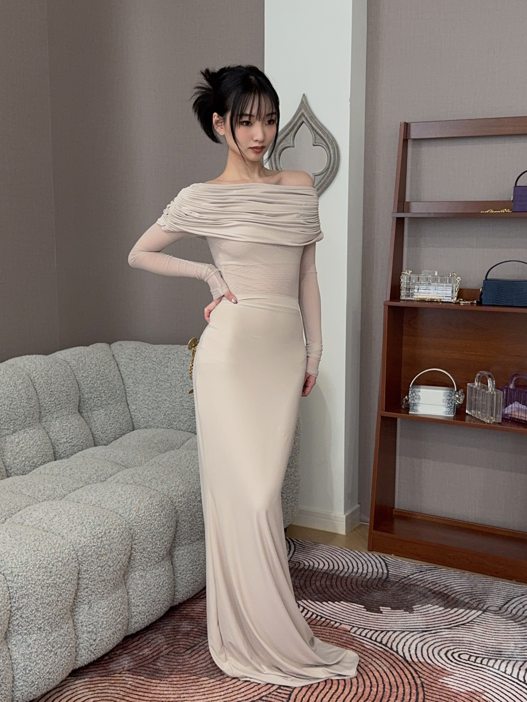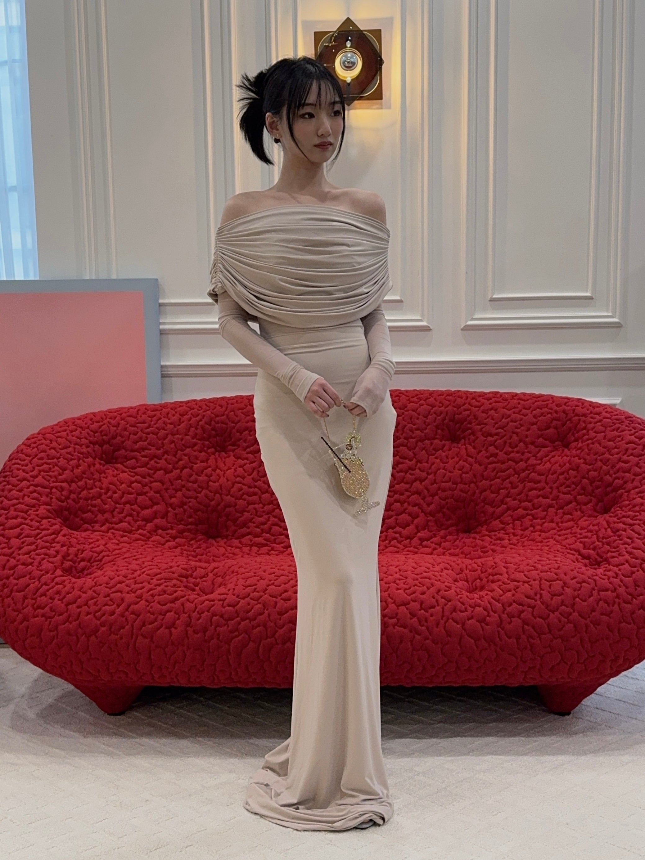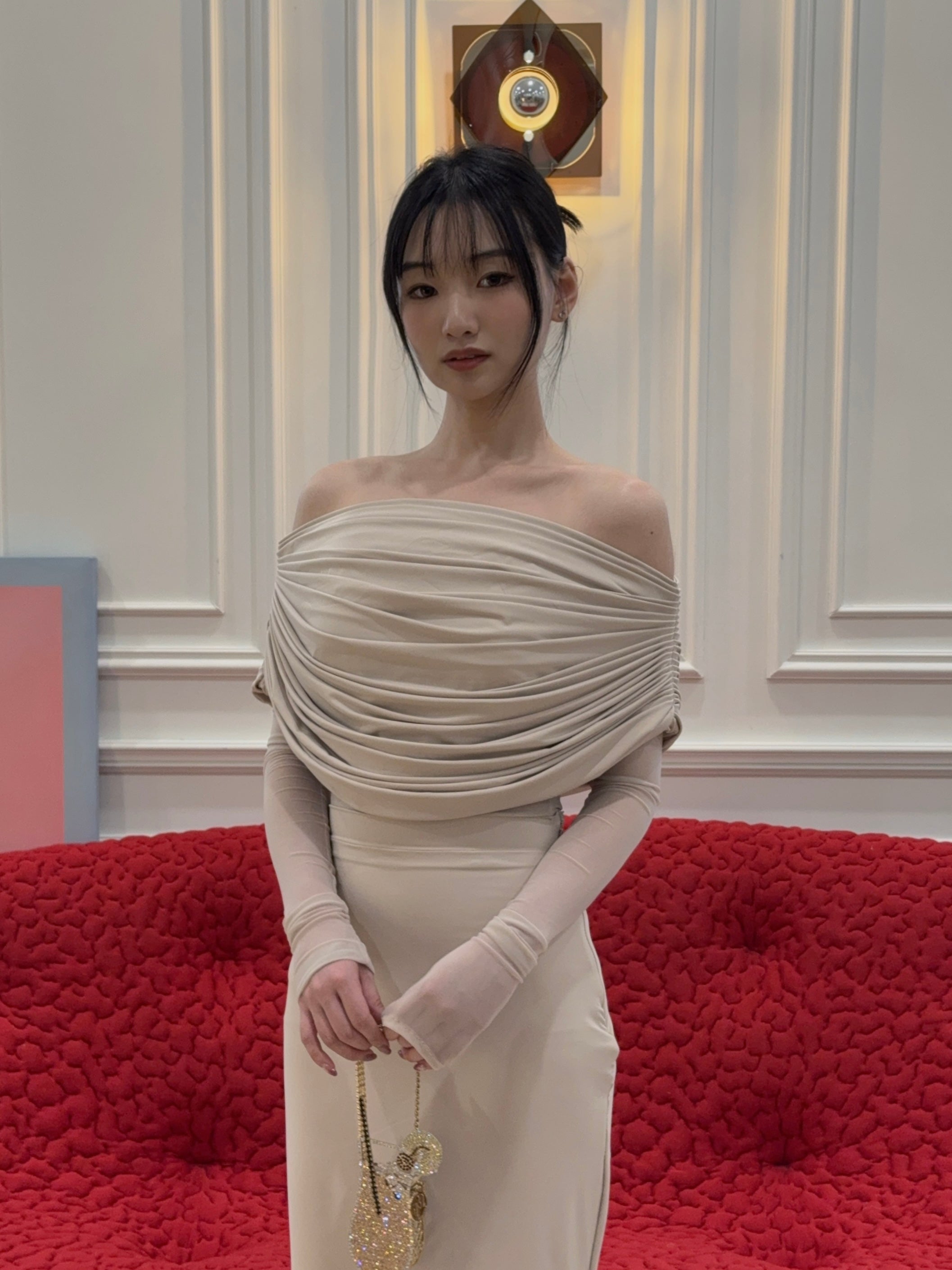 A statement in egg white, this co-ord set features a sculpted pleated bodysuit paired with a fluid floor-length skirt. The cinched waist enhances the silhouette while the soft drape adds movement and ease, making it perfect for elegant soirées, weddings, and refined evening occasions.