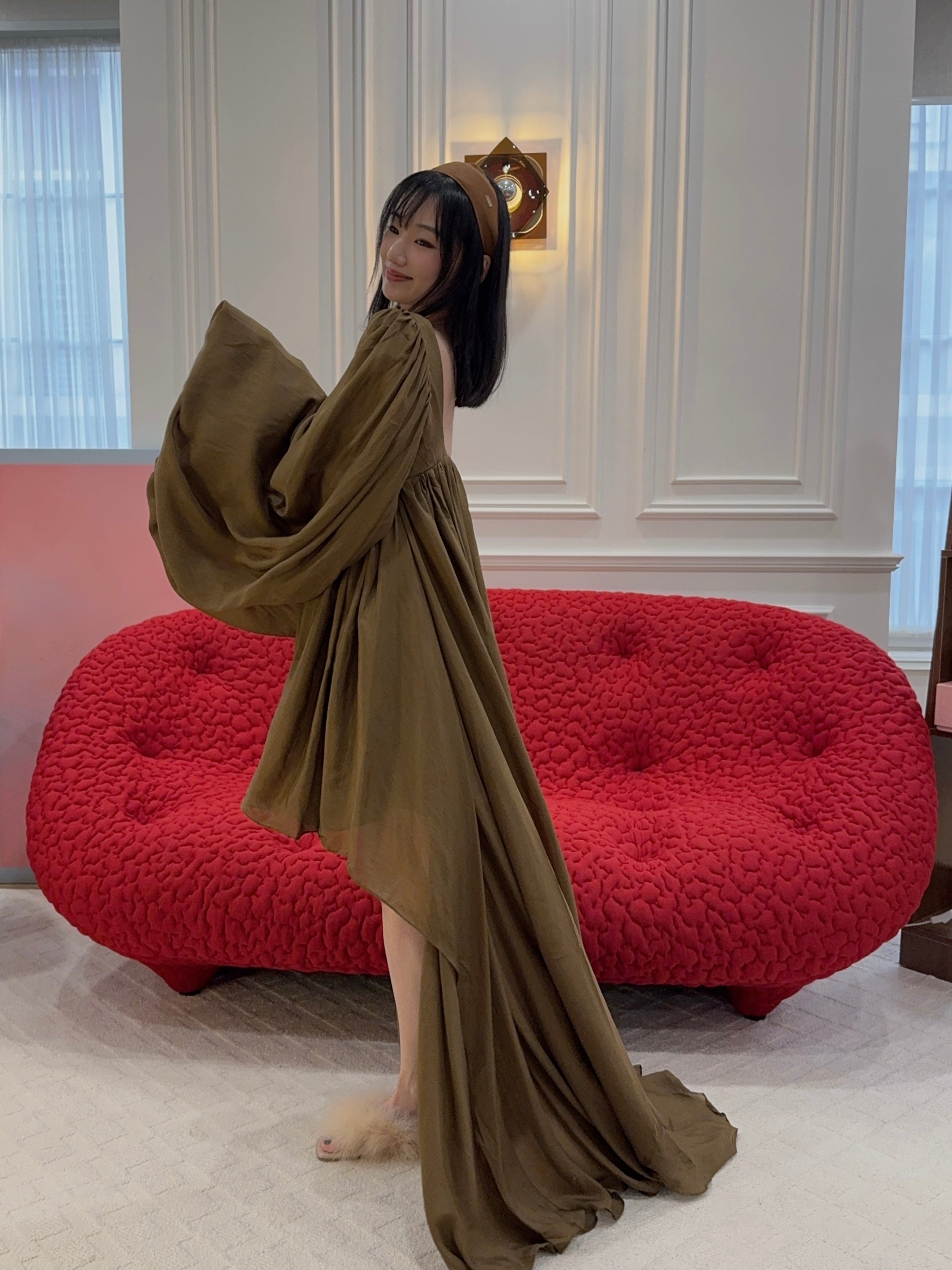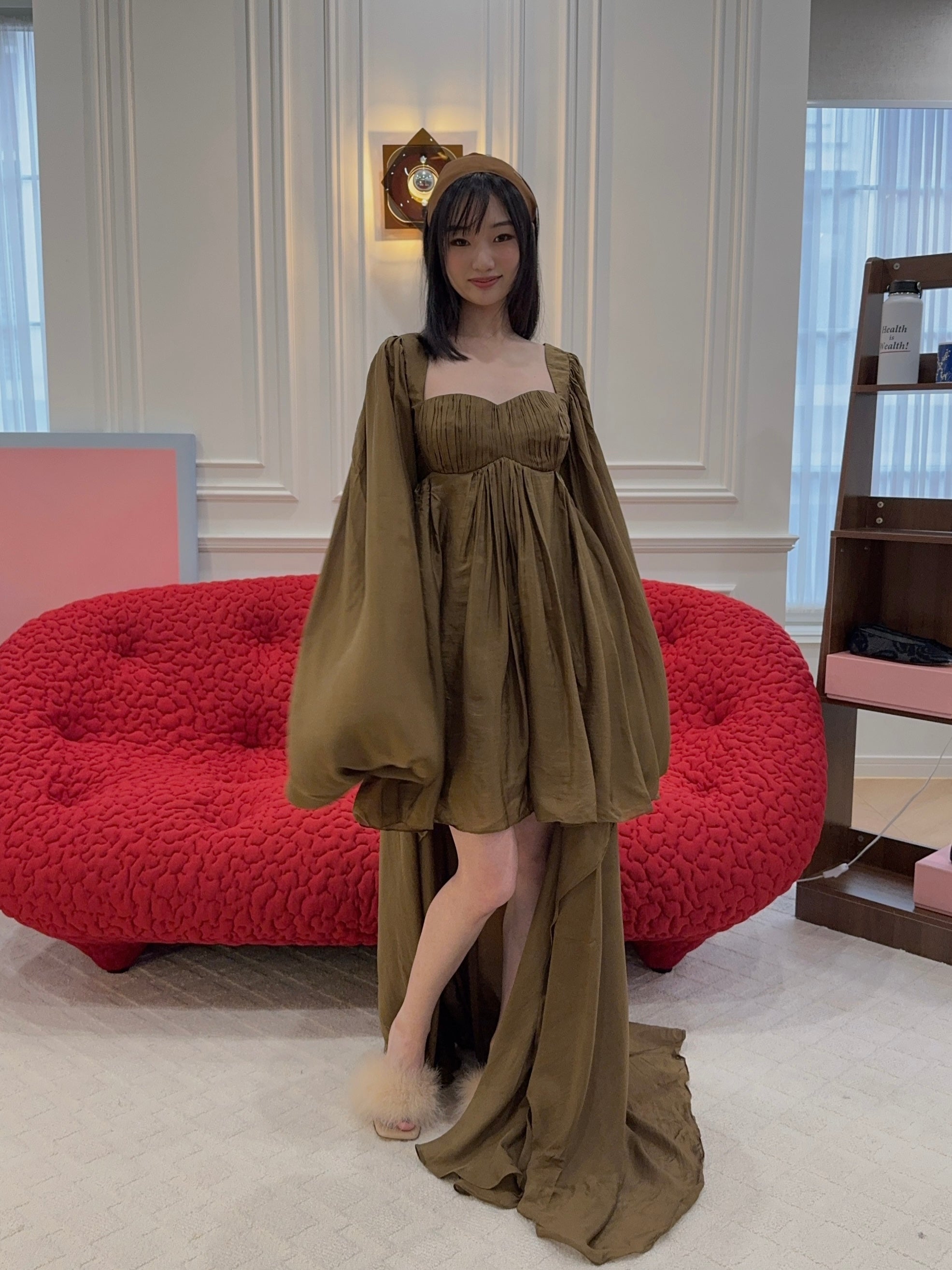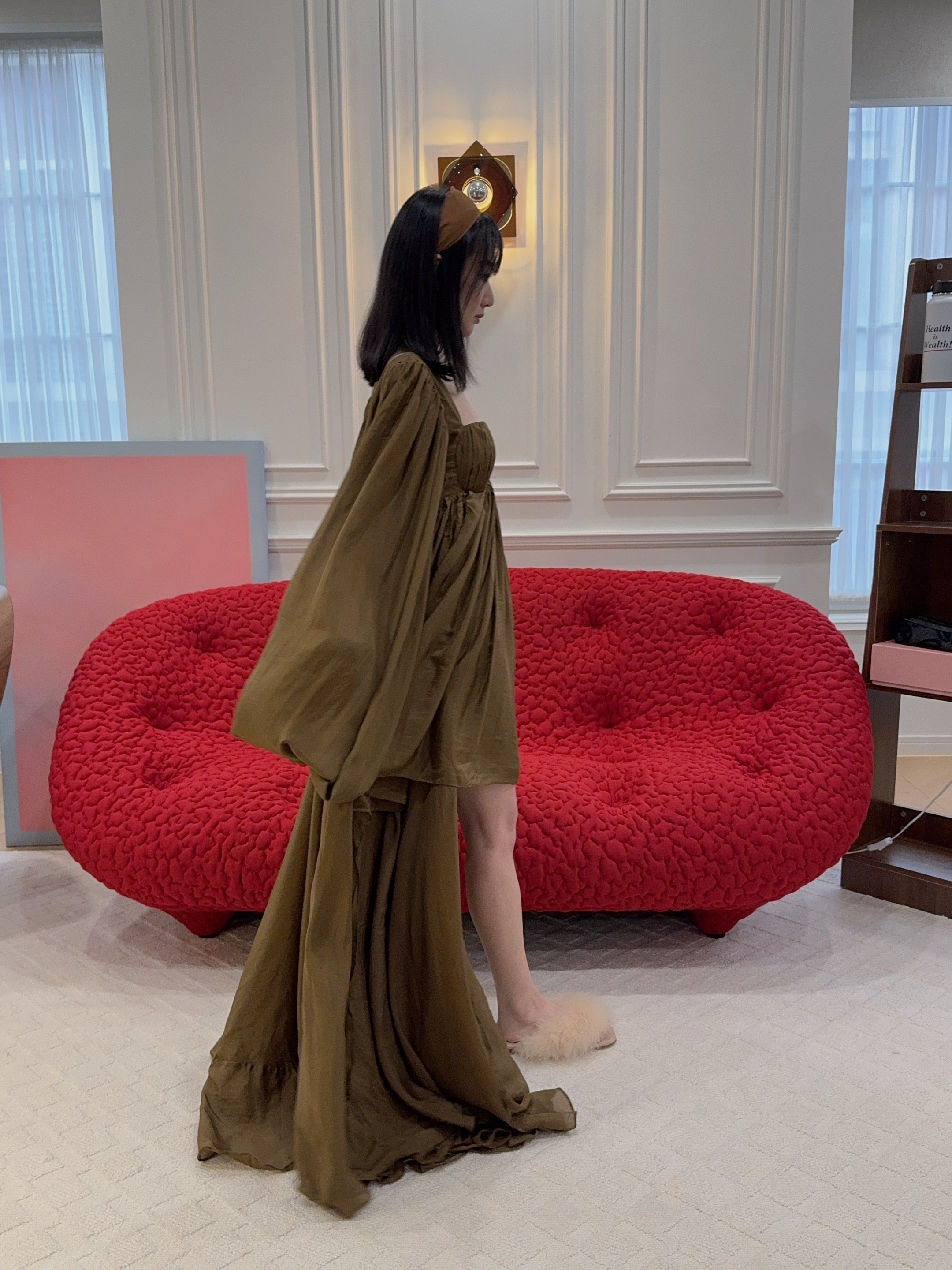 Effortlessly playful with a hint of drama, this sand green chiffon dress brings together structure and softness in perfect harmony. Designed with a flattering square neckline, the bodice features delicate ruching that contours the bust, while exaggerated balloon sleeves add volume and flair. The high-low hemline reveals a shorter front that transitions into a flowing, elongated back—creating movement with every step. Light, airy, and unapologetically feminine, this dress is made for moments that linger.