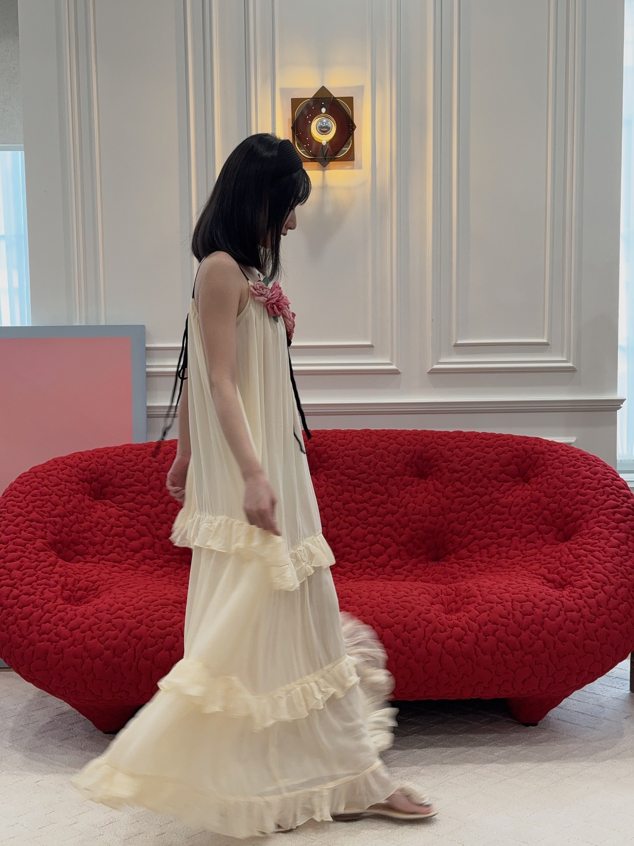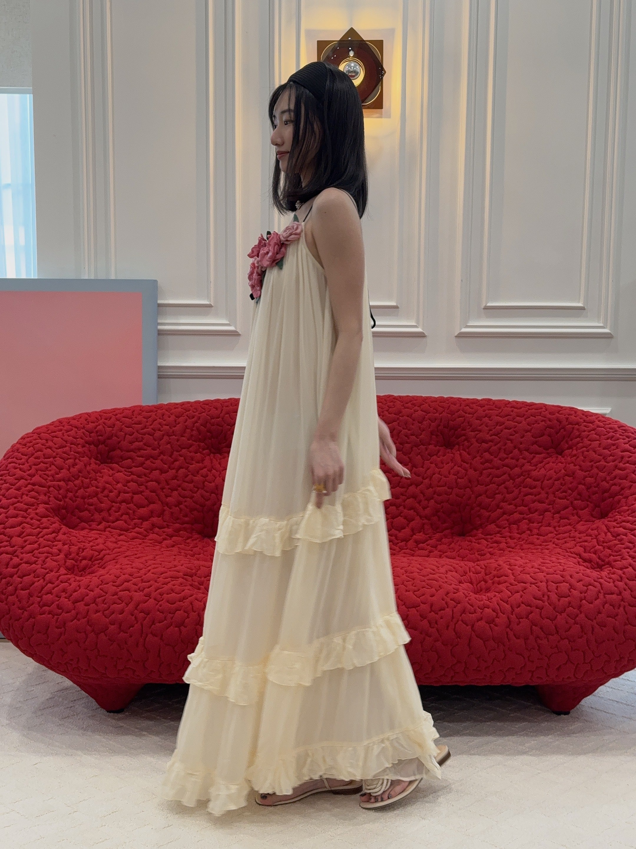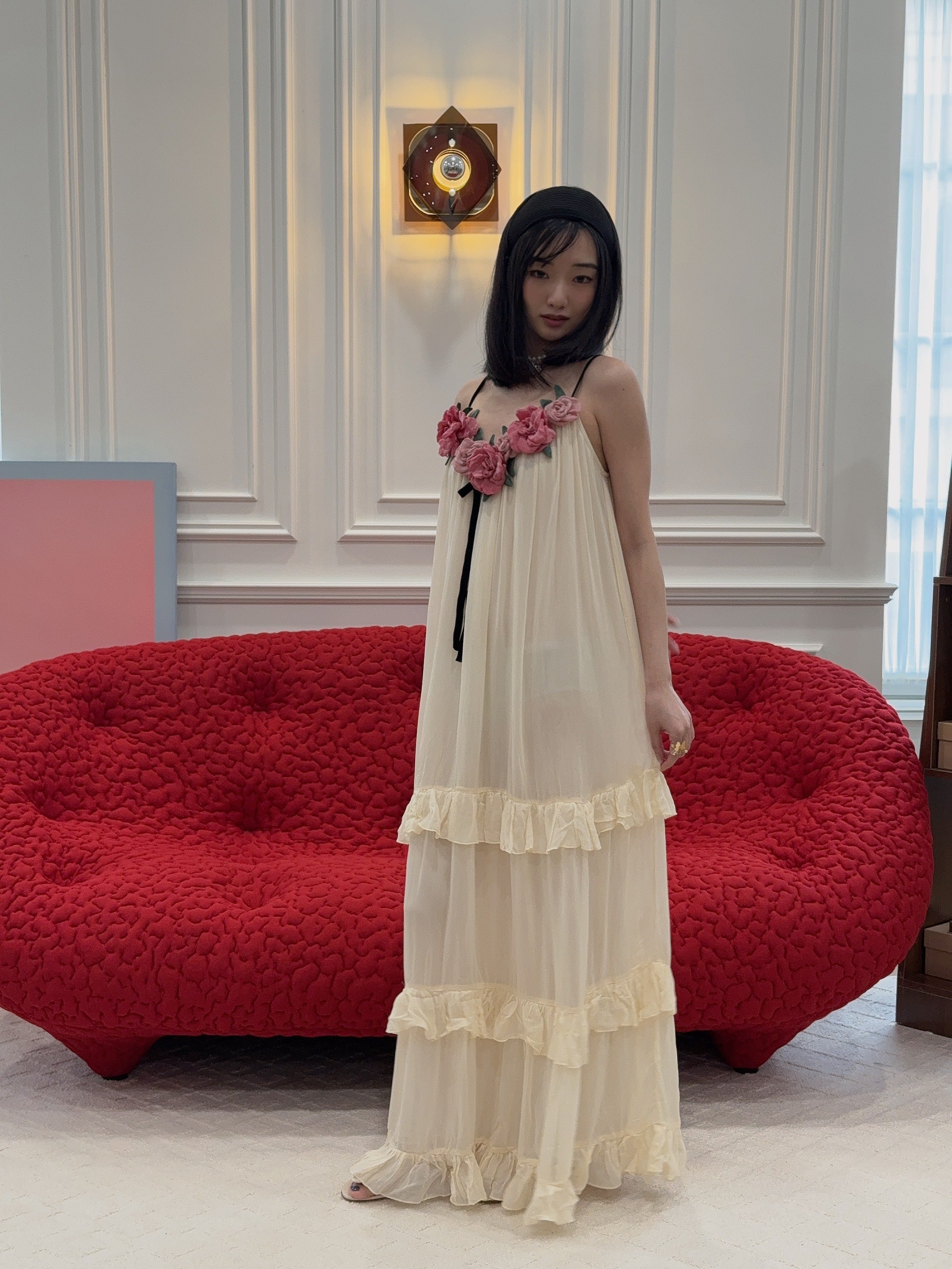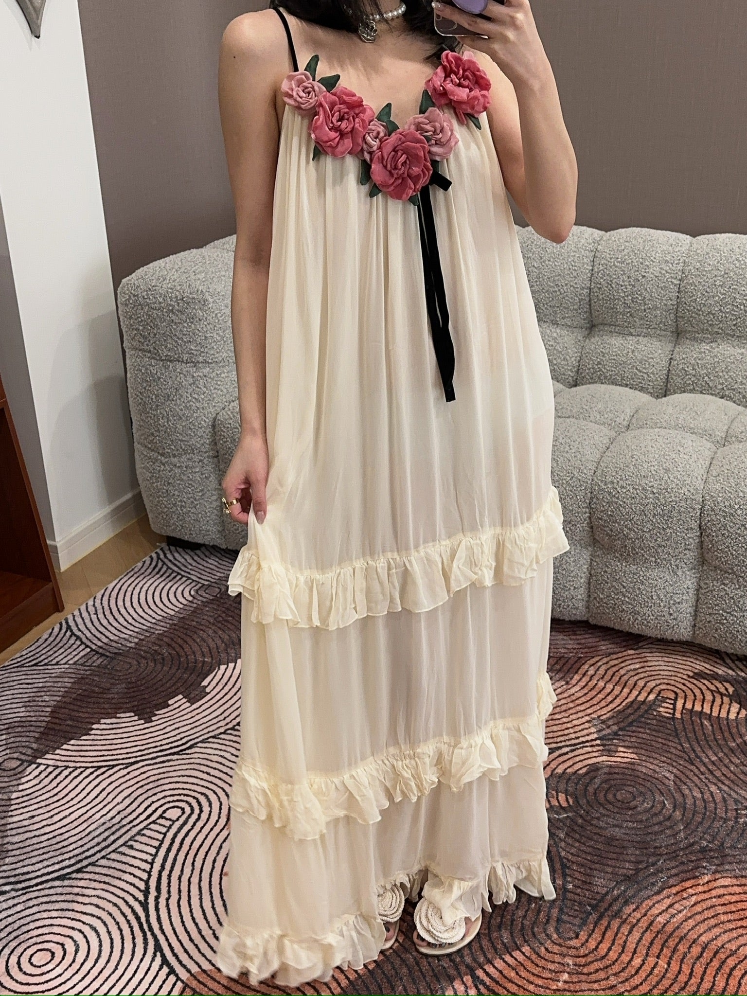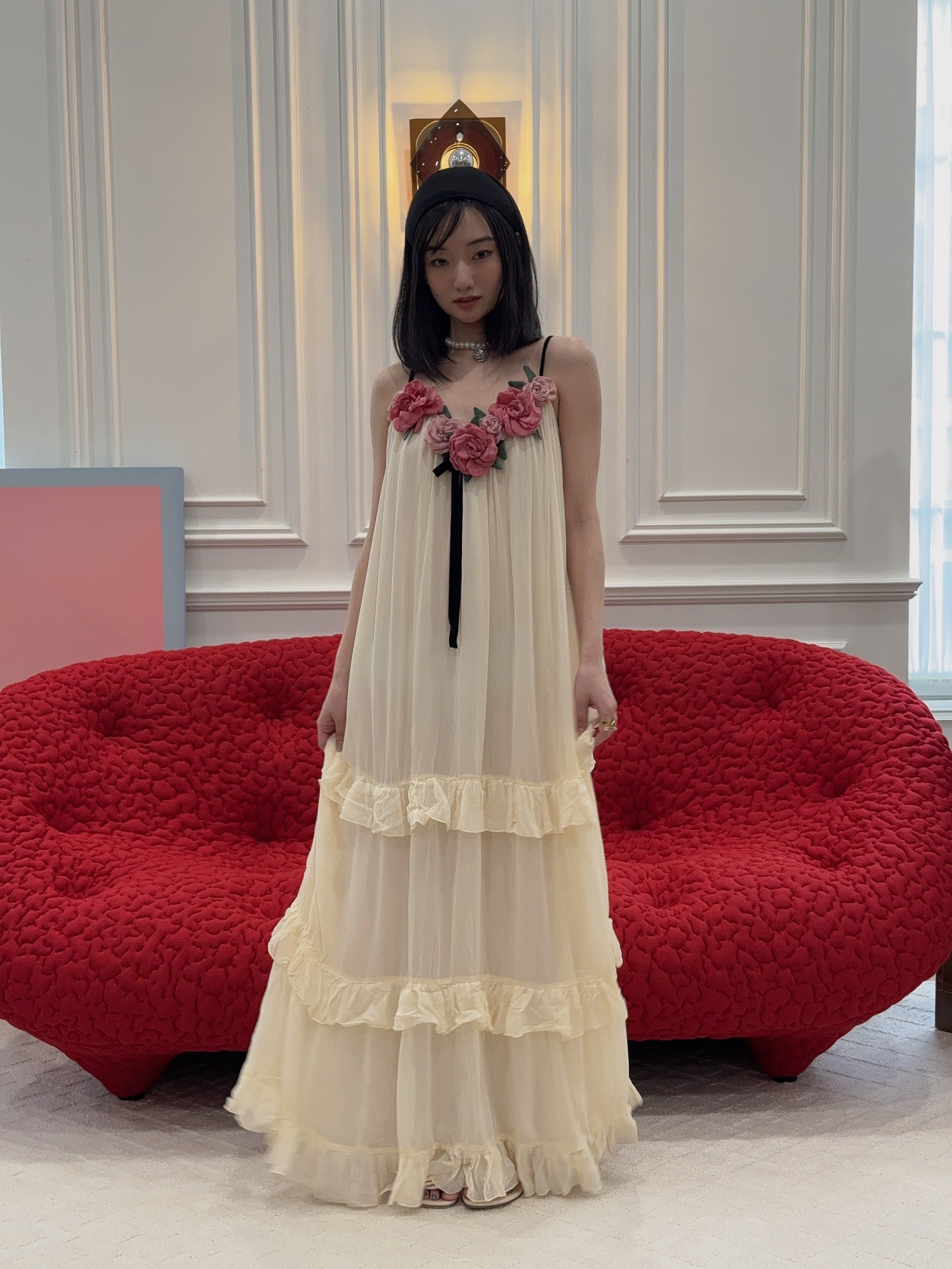 Become the belle of the ball in the Rosalie cream maxi dress—a long gown crafted in georgette with contrast velvet shoulder straps and intricate handcrafted rosette embellishments along the neckline. This party dress features tiered ruffles along the skirt and gathering at the neckline and ruffle seams for an ethereal silhouette.