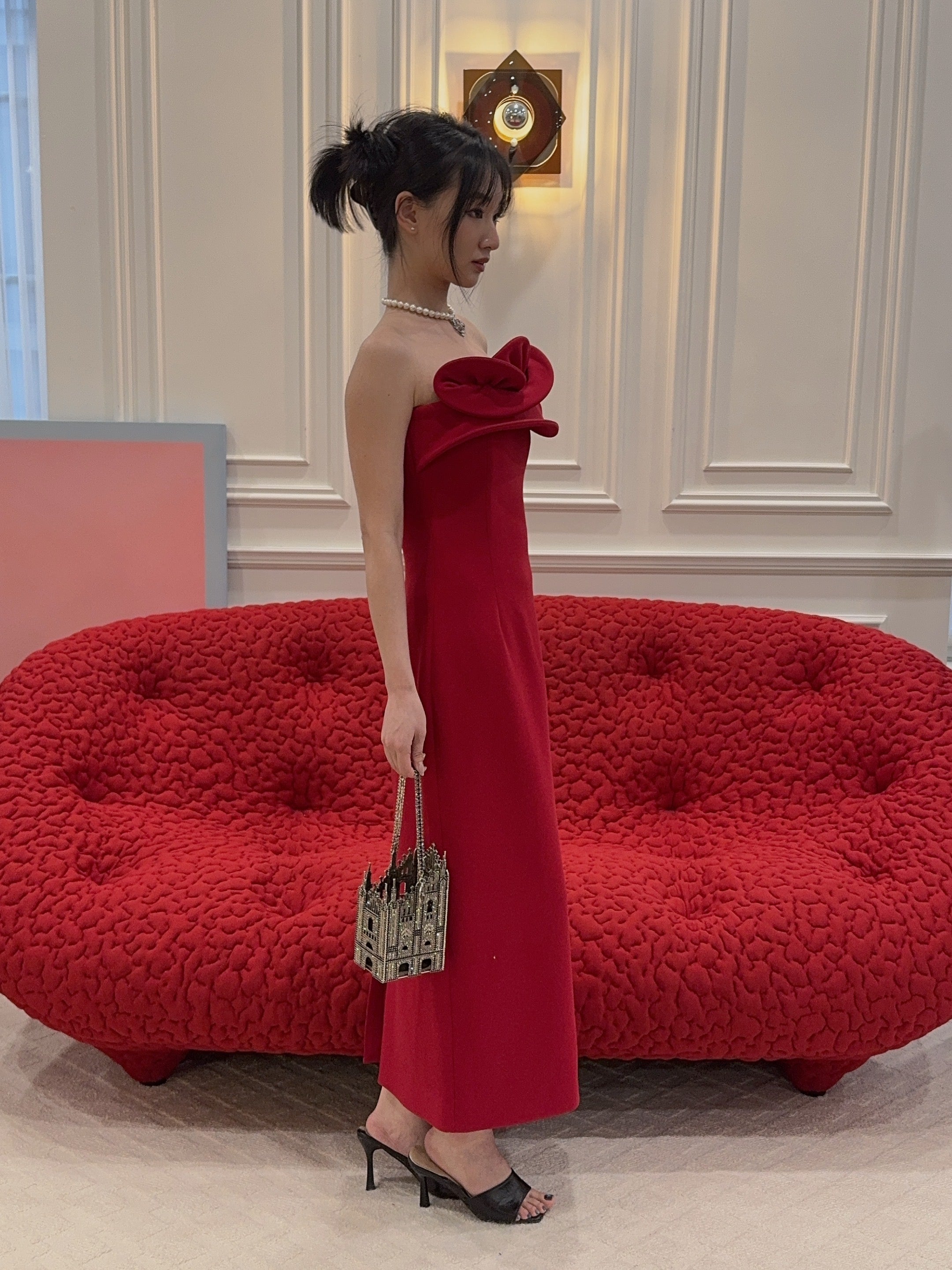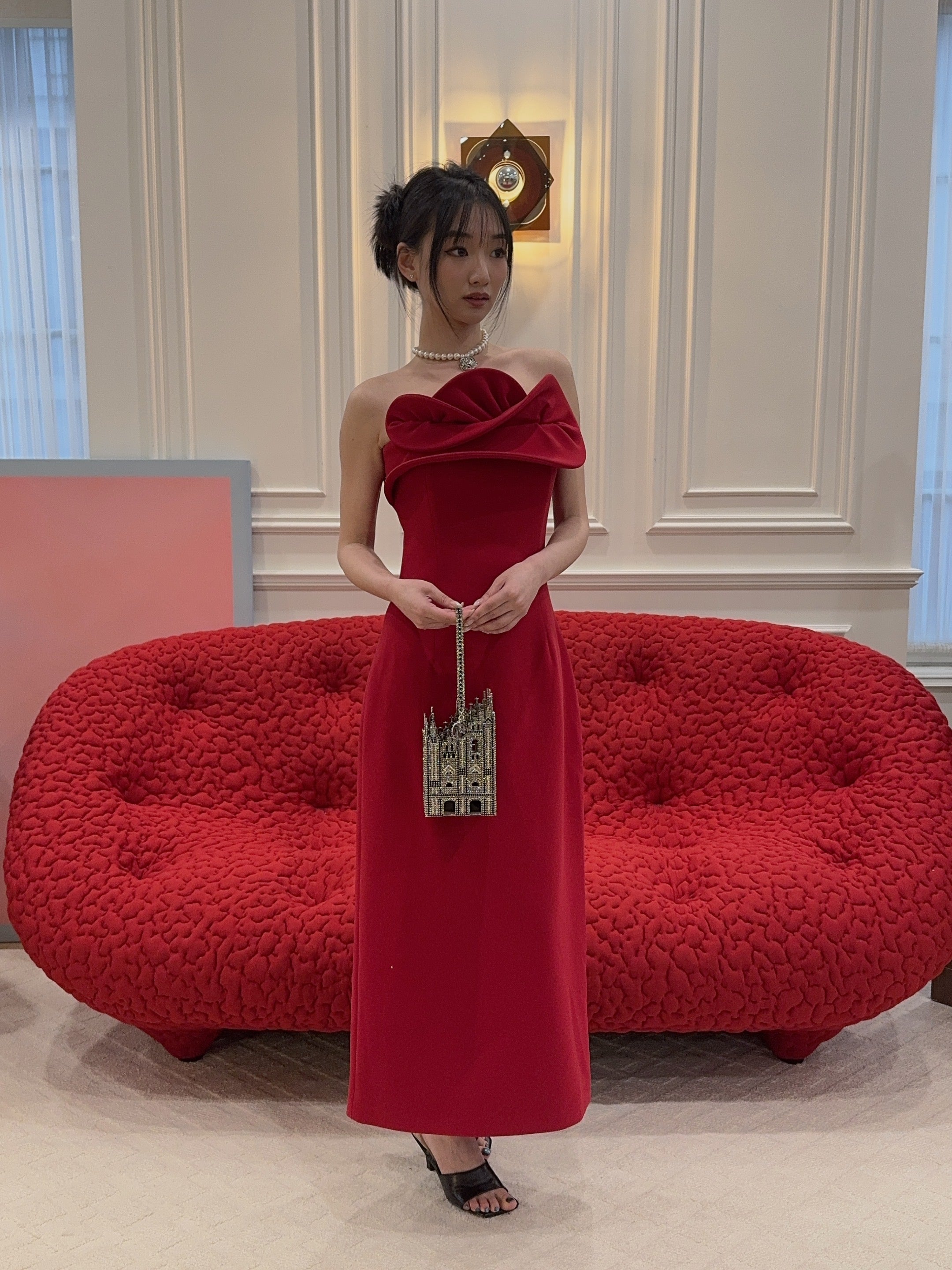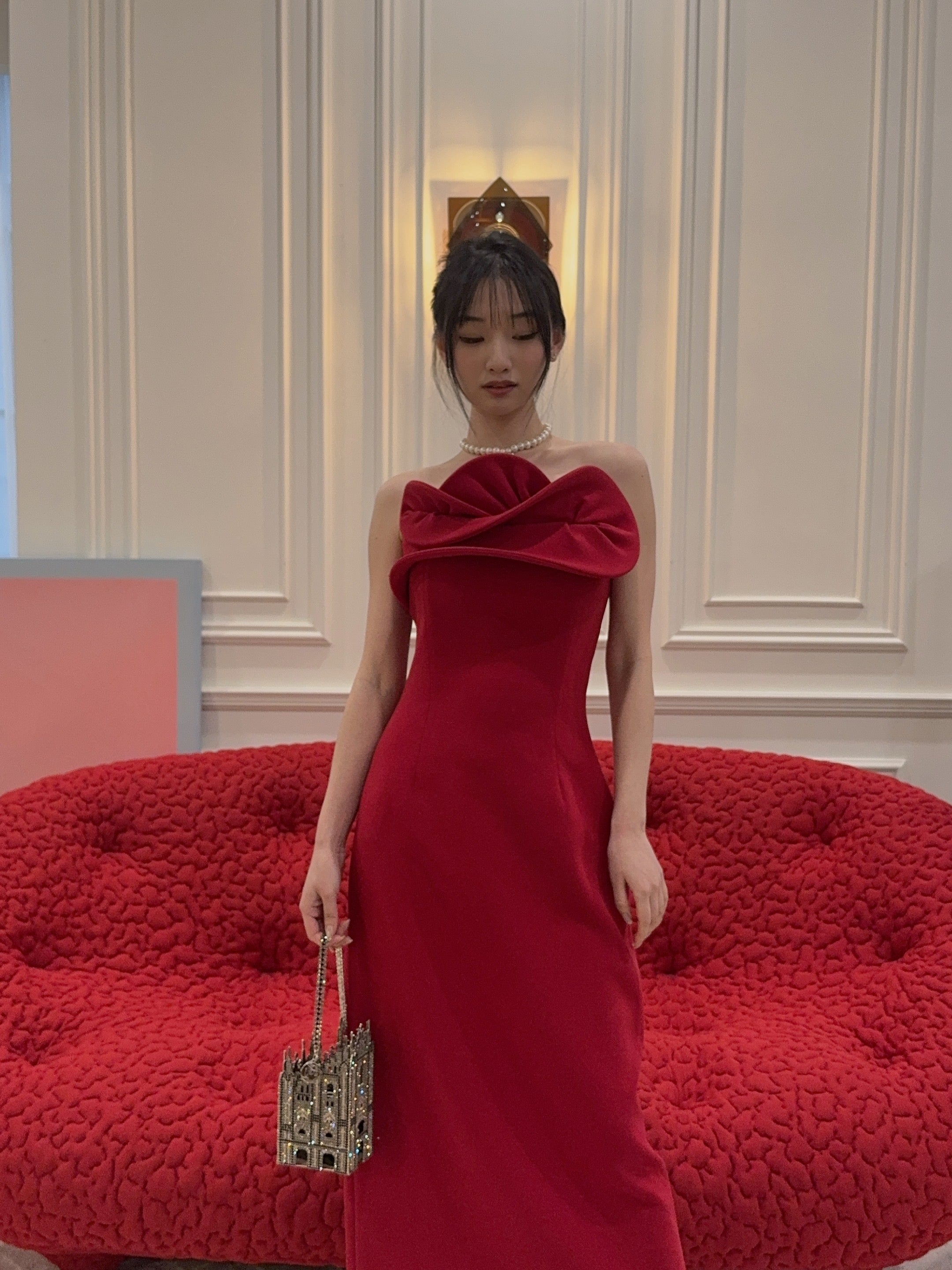 A refined below-the-knee dress crafted from wool. The silhouette is structured yet fluid, featuring a fitted bodice with an internal corset that enhances the waist and bust. The neckline is adorned with a sculptural folded overlay, shaped into a floral swirl. Closes at the center back with a concealed zipper and a delicate slit beneath for ease of movement. The inner corset secures with hook-and-eye and bra closures for a seamless finish.