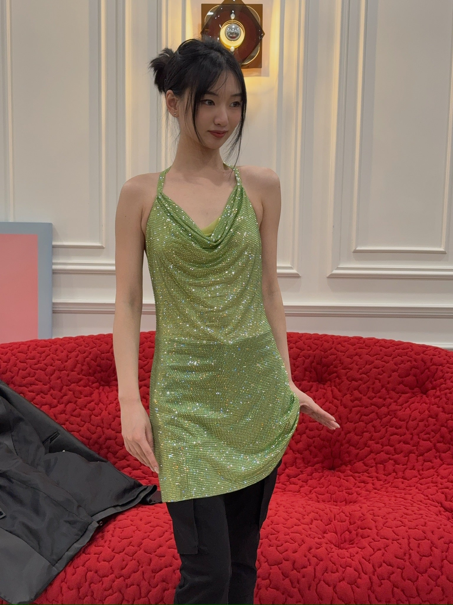 Crystal-embellished halterneck mini dress from GIUSEPPE DI MORABITO featuring light green, glass crystal embellishment, draped detailing, halterneck, scoop neck, backless, straight hem and above-knee length.