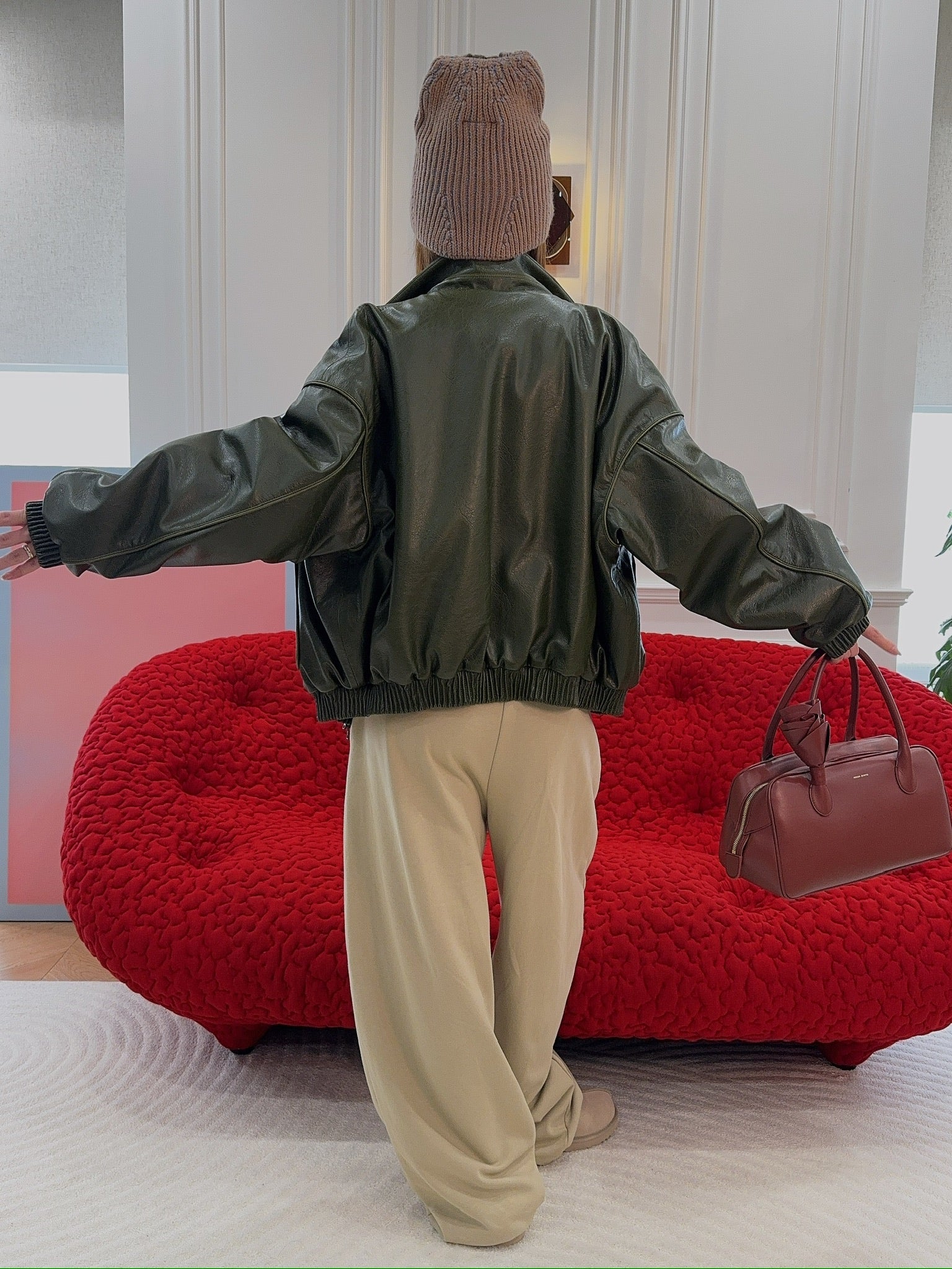 You can easily unleash your inner rebel with our PERIDOT LVIV bomber, infused with a retro vibe and modern edginess. Cut from fine vegan leather with a vintage effect on it, this bomber adds an instant pop of style to any outfit. The timeless design and oversized fit, combined with the attritional shade of green, makes it versatile, but at the same time a very unique piece - an undoubted add to your wardrobe.
