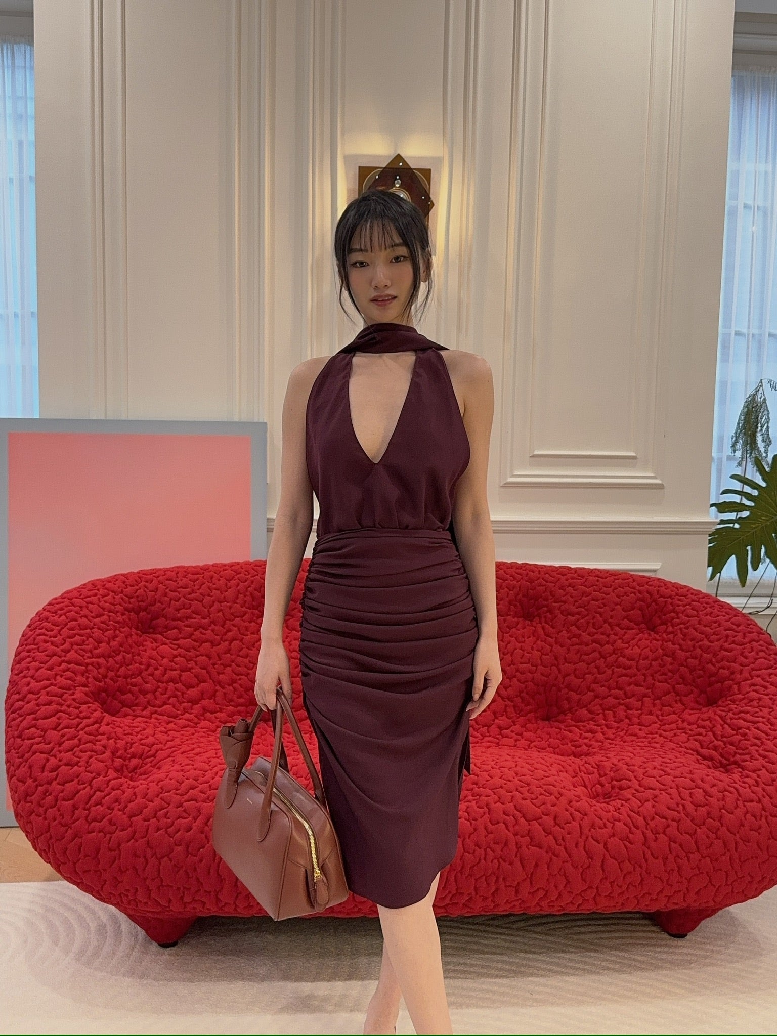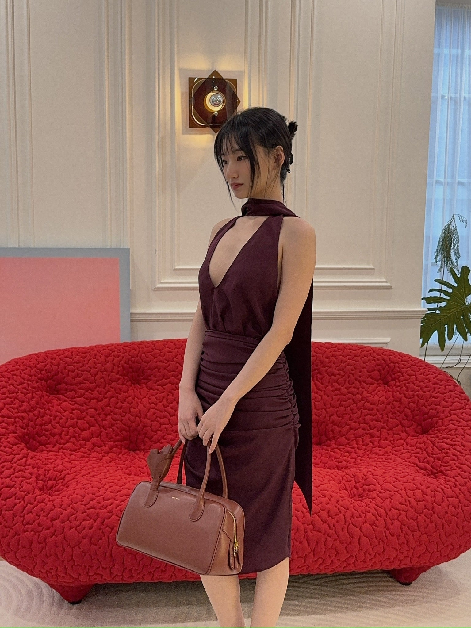 Striking short dress crafted in soft stretch jersey, featuring a plunging neckline and side draping for a sculpted silhouette. Includes a removable matching scarf detail that wraps elegantly around the neck. Designed without pockets and finished with a concealed side zip.