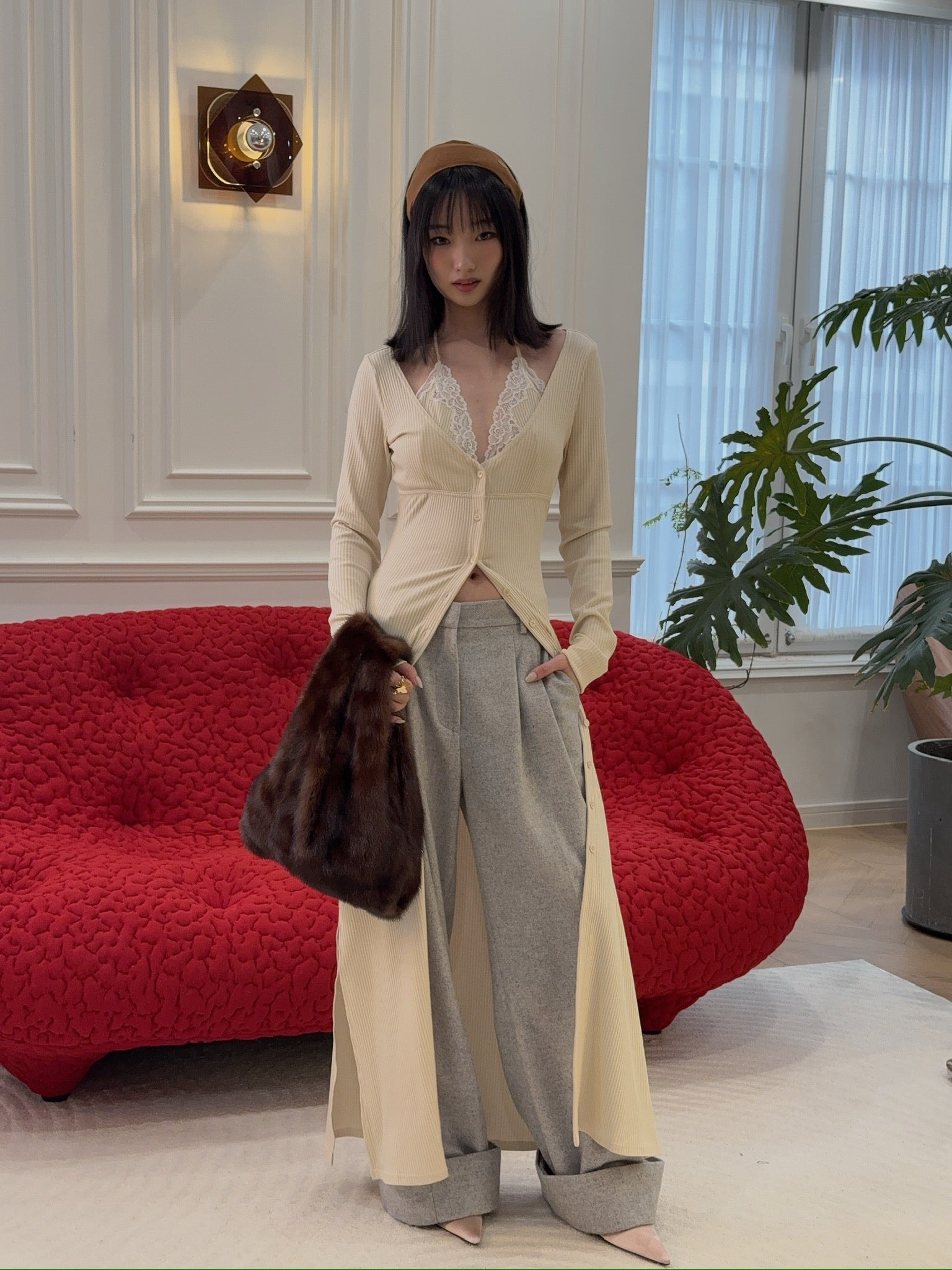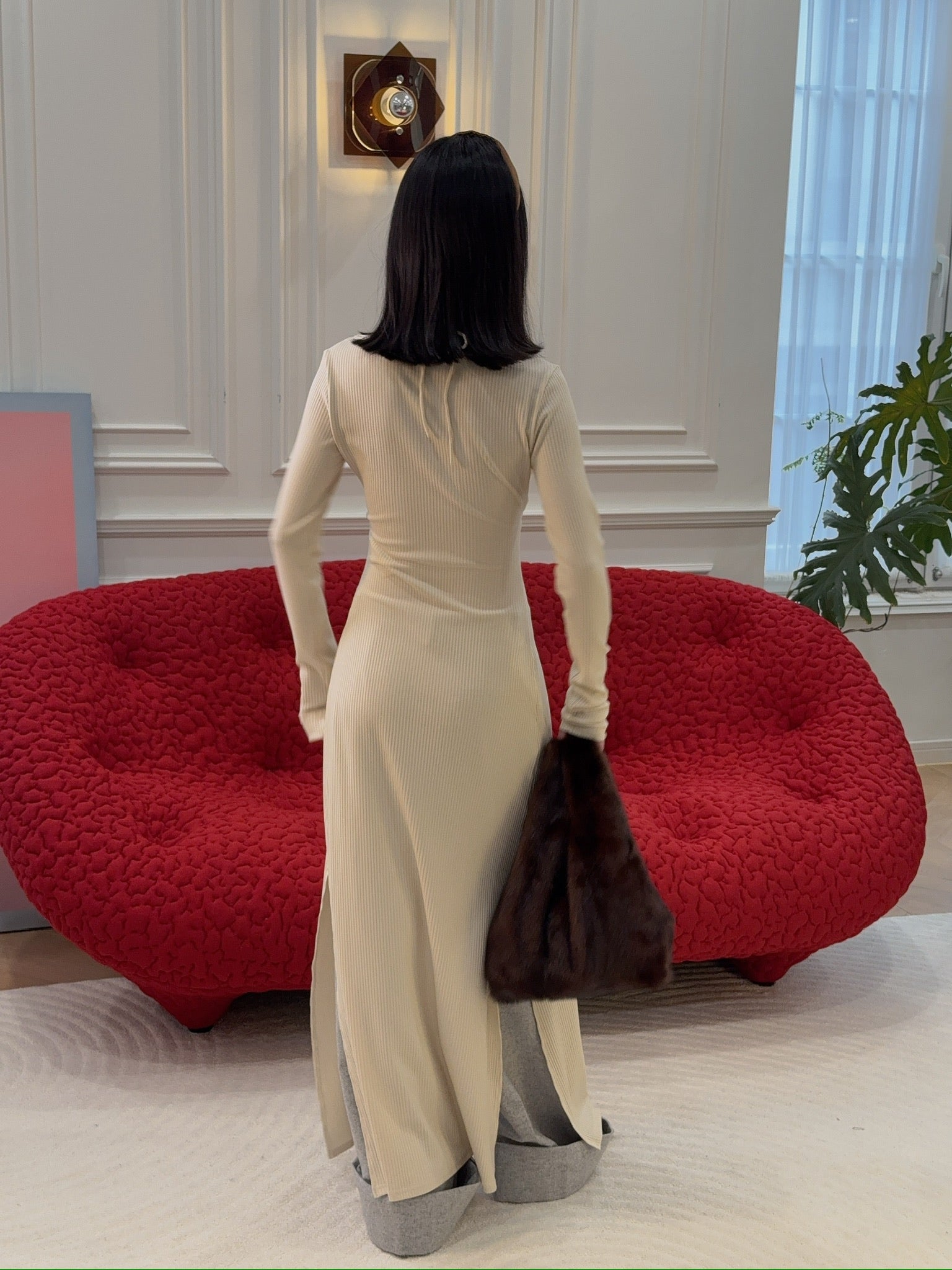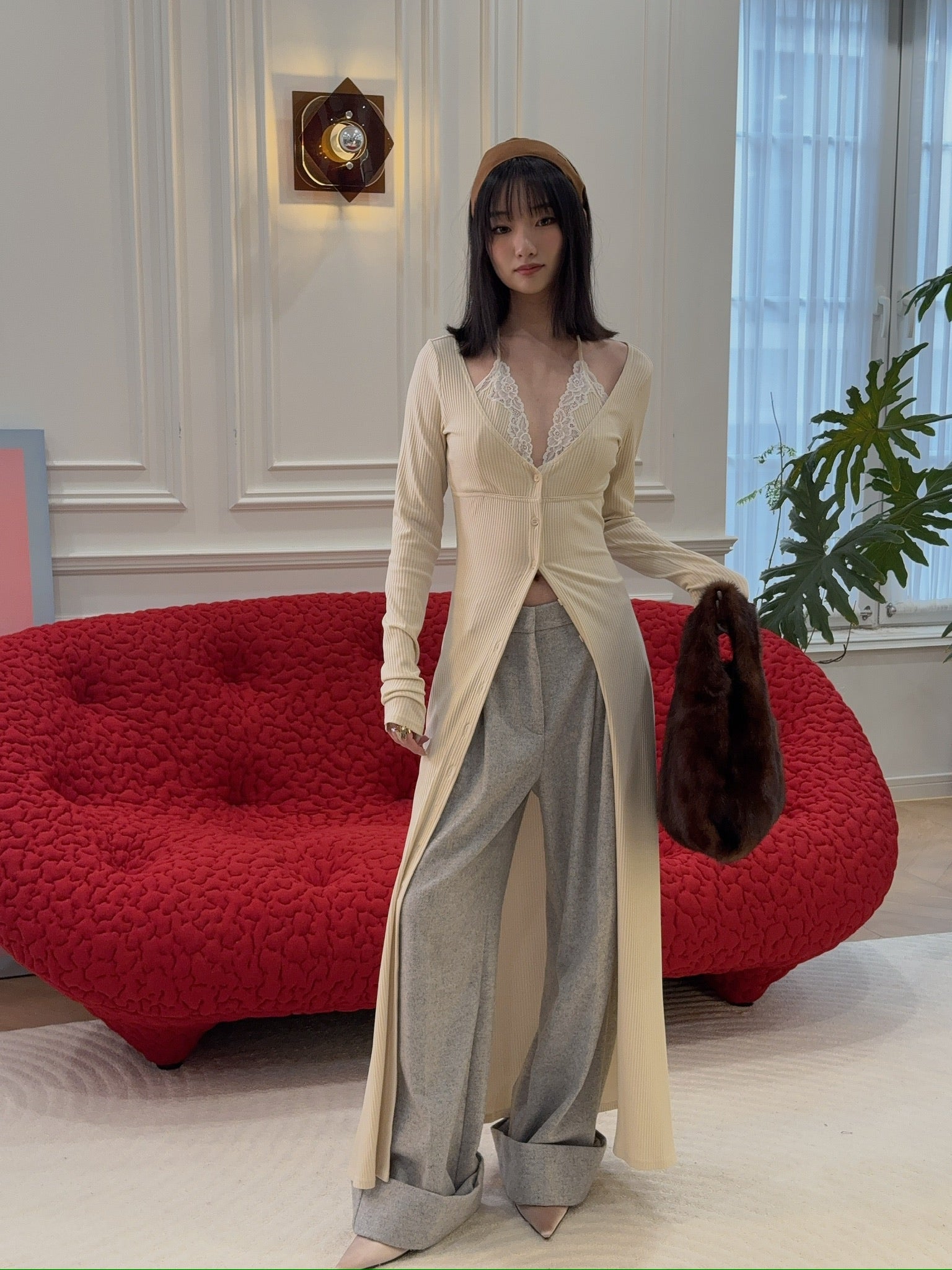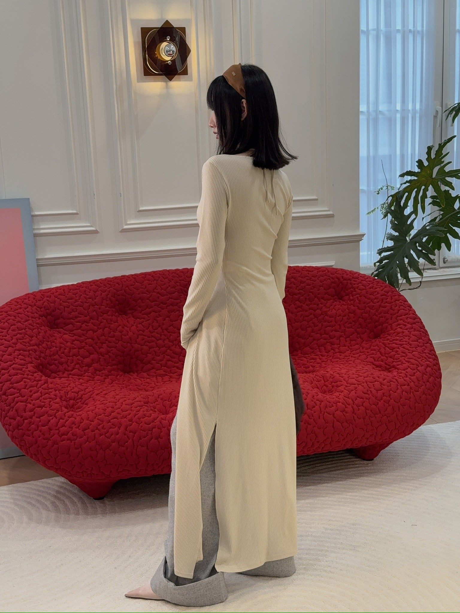 Slim-fitting, ankle length cardigan dress featuring a lingerie-inspired layered bra neckline with a tied back closure. Made of compact and stretchy lyocell ribbed jersey. Fastens with a center front button closure. Unlined. Womens. Fits true to size.