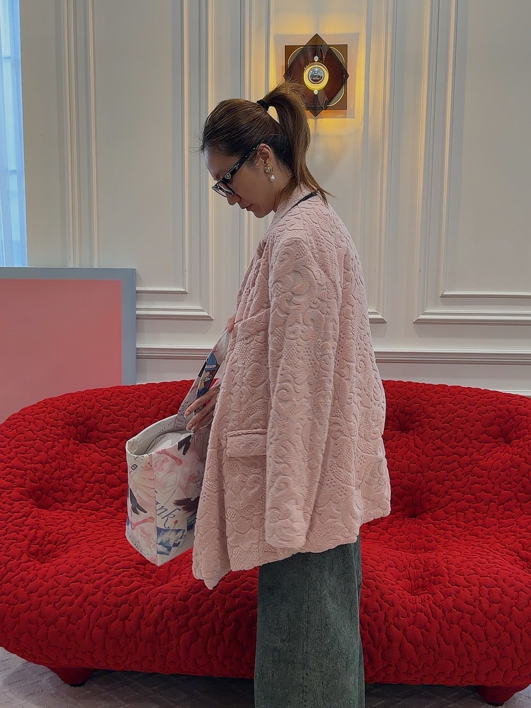 MARTINE ROSE jacket in pink, paneled cotton construction, raised textured pattern, notched lapel, double-breasted wrap-style button closure, structured shoulders, long sleeves, surgeon's cuffs, chest welt pocket, side welted flap pocket, back vent, straight hem, boxy fit.