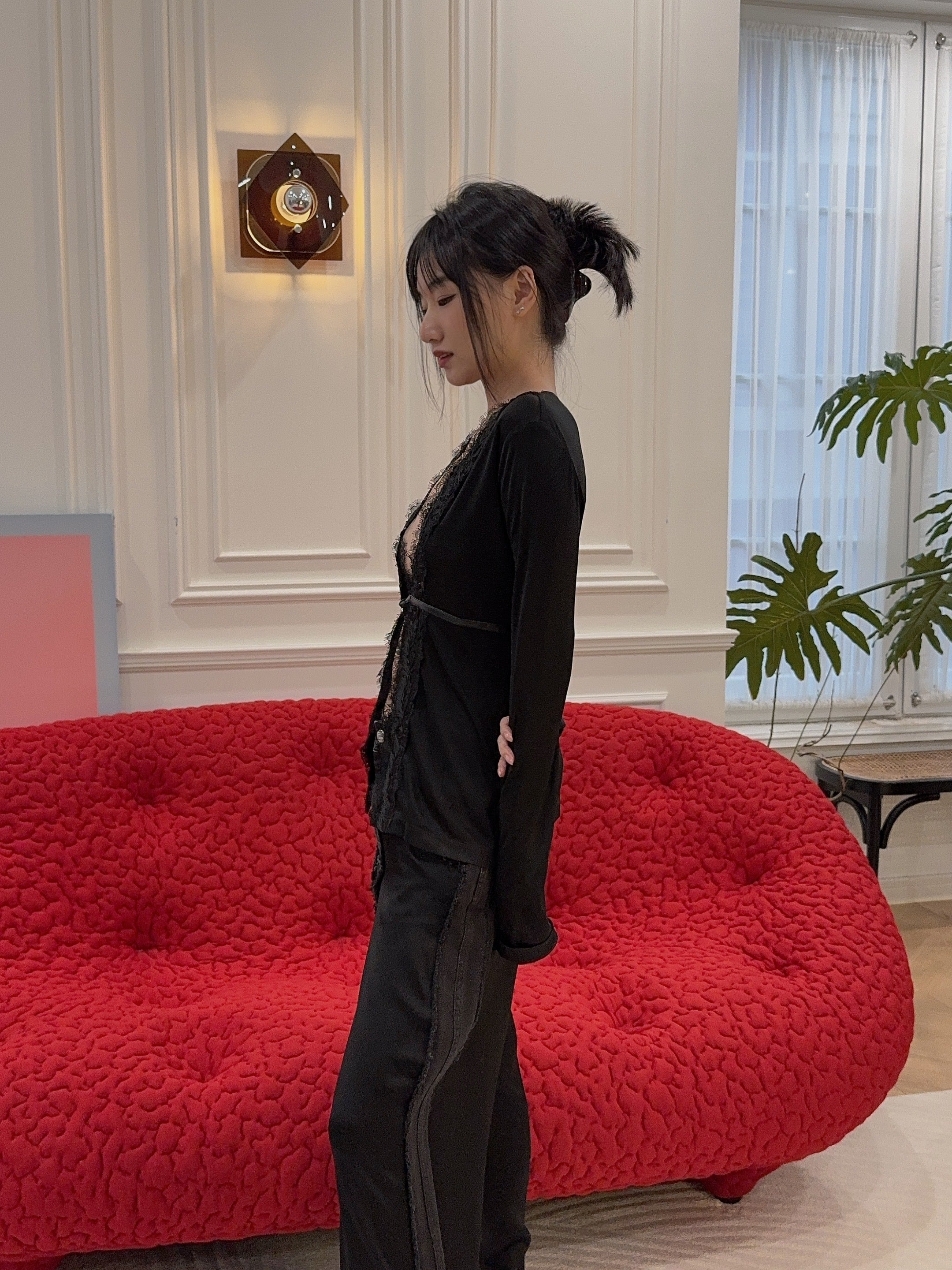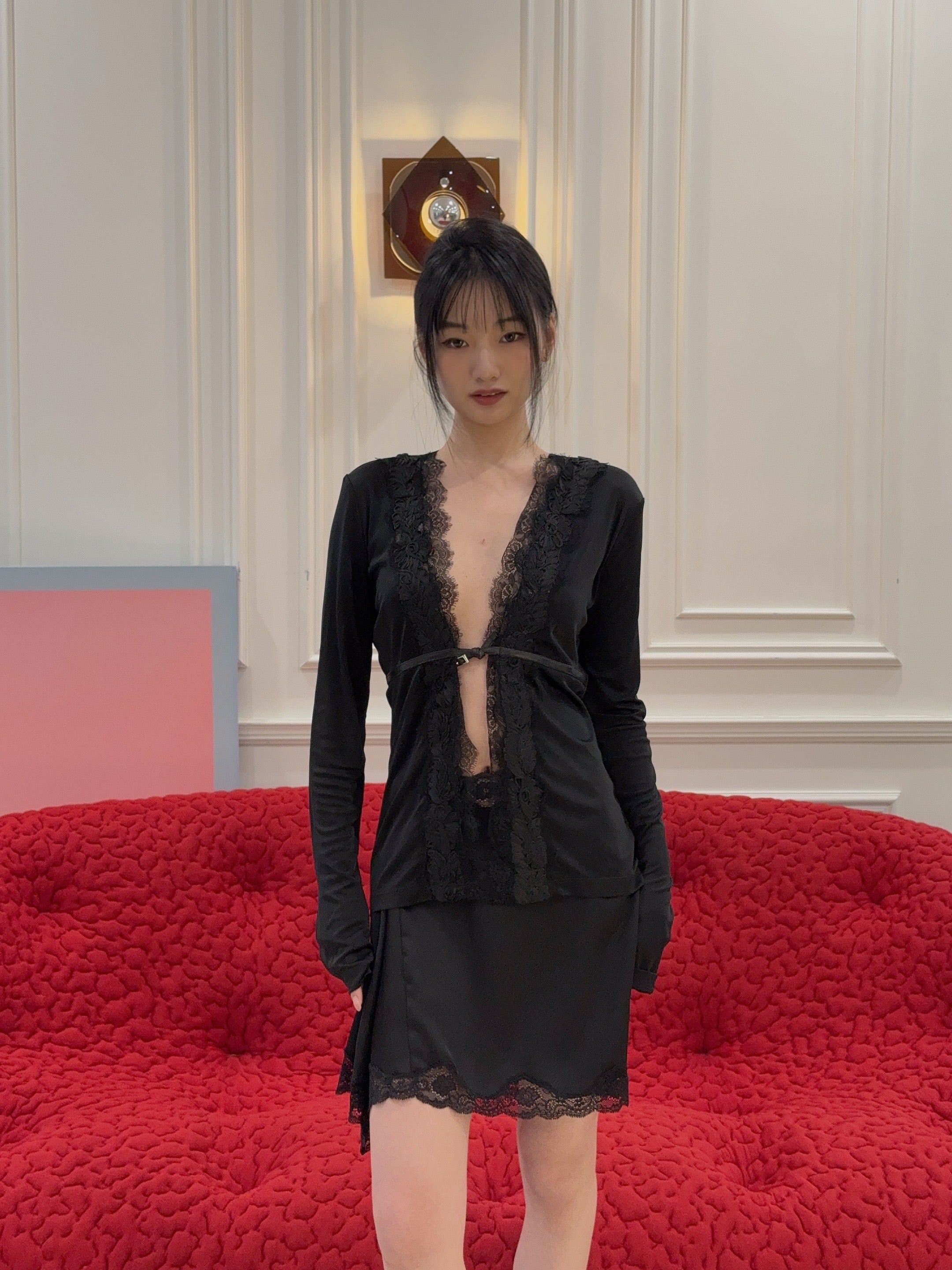 VAILLANT - Long Sleeve Fitted Cardigan with Lace Trim & Belt Det in Black