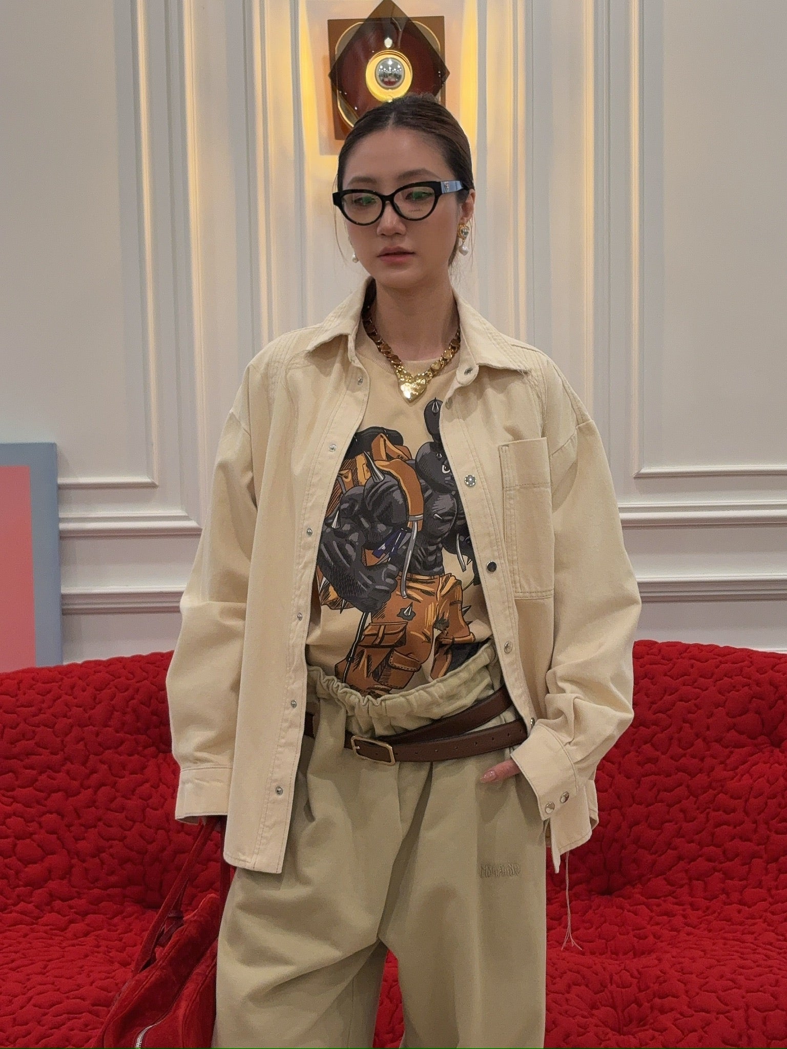 The overshirt is made of heavy cotton twill that feels like raw denim. This piece has an asymmetrical seamline on the front and an oversized patch pocket. It has silver snap button closure with a single A-motif button.