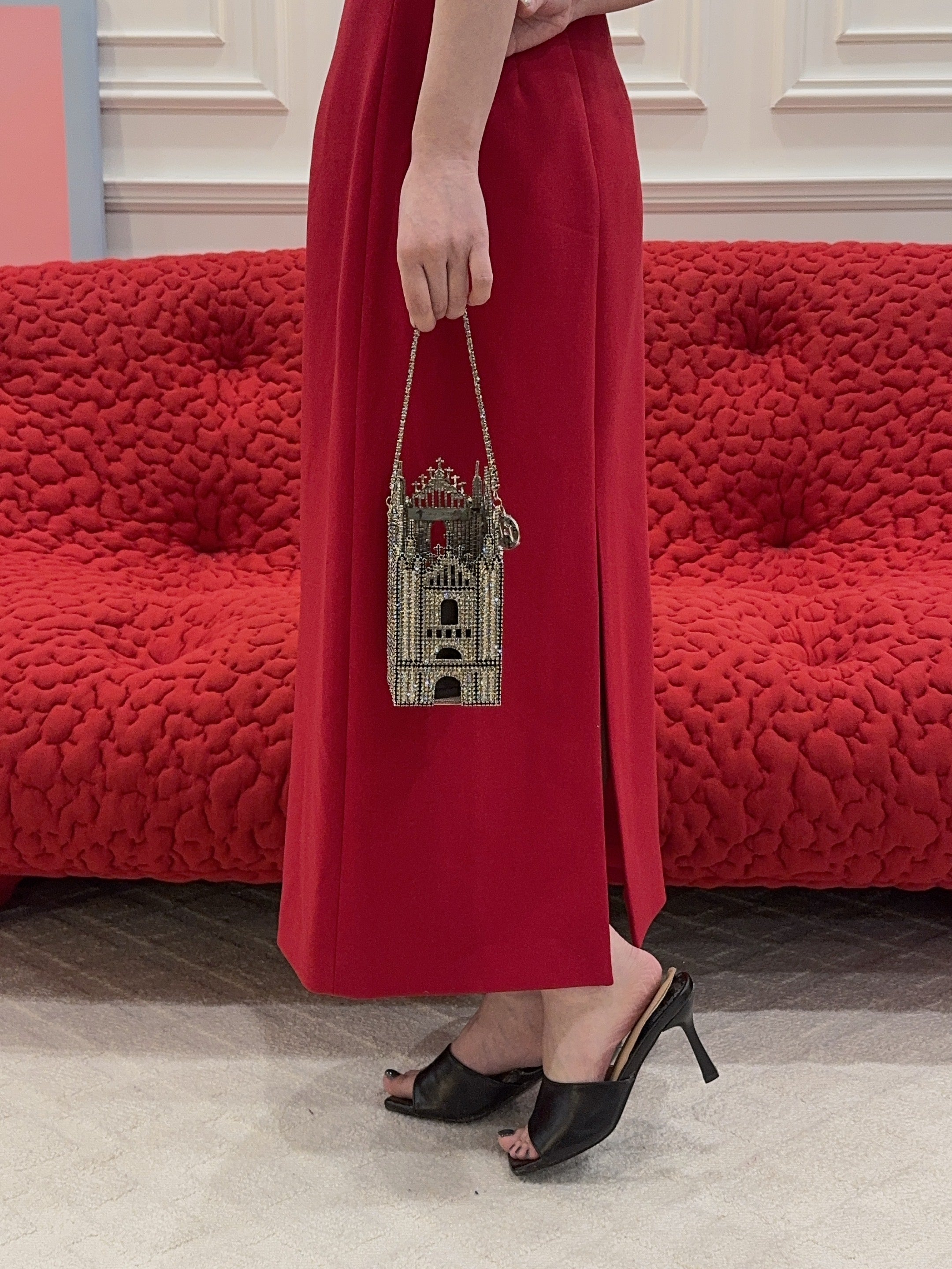 Milano is one of the stops on Michela Panero's journey around the world and the spiers and marbles that make up the facade of the gothic Duomo inspired her in the creation of this unique piece, made of silver toned brass and clear and black crystals.