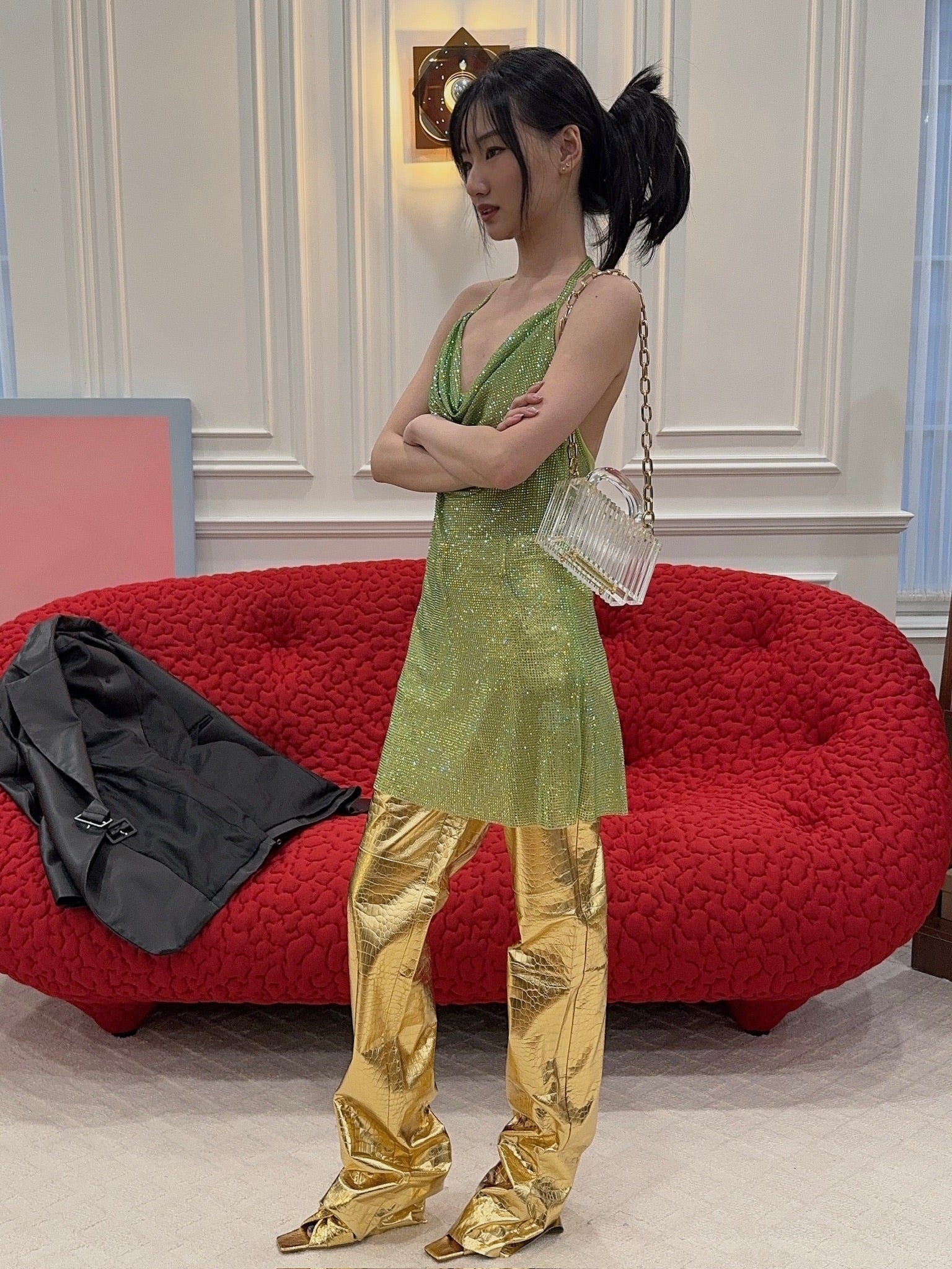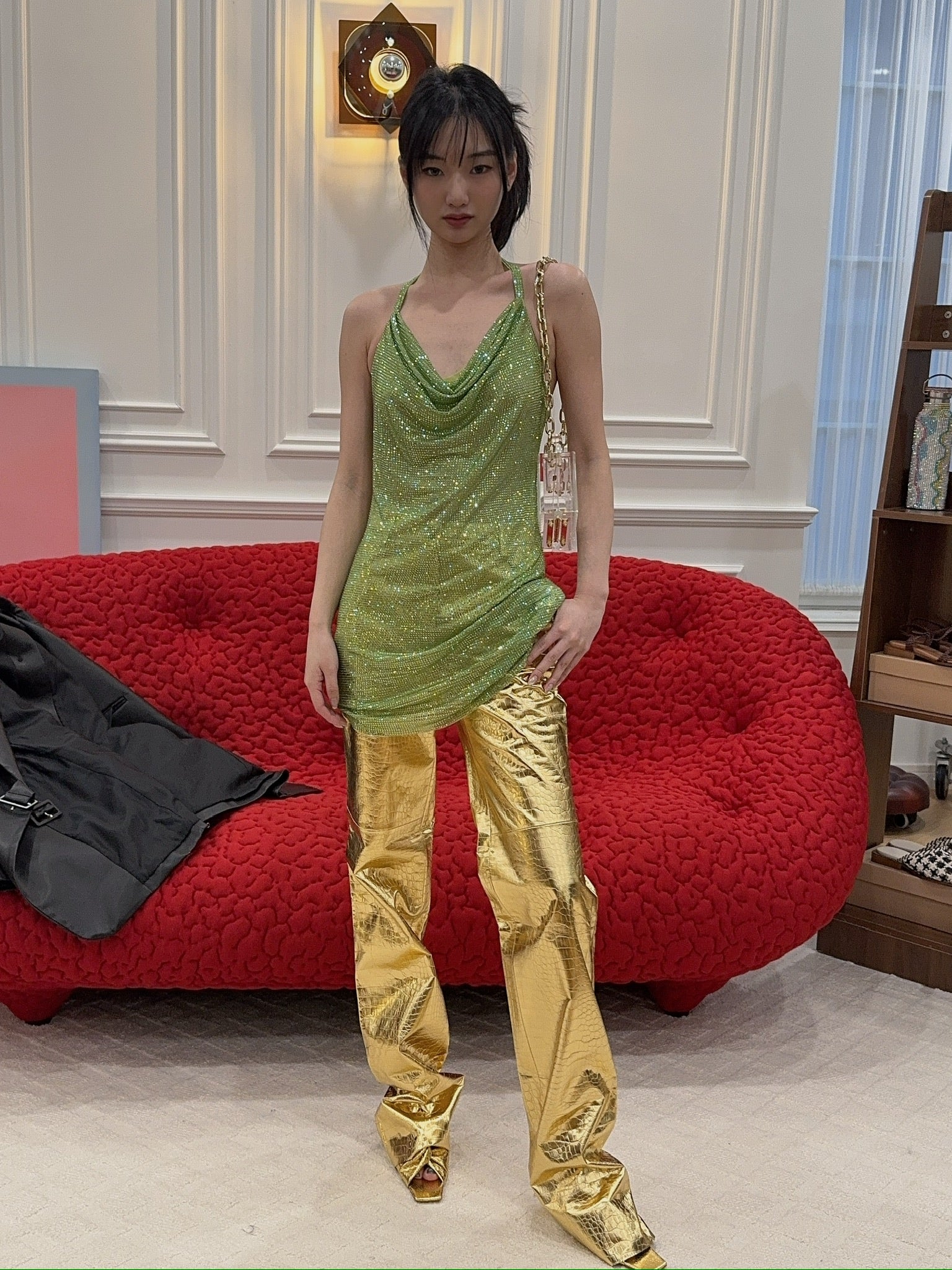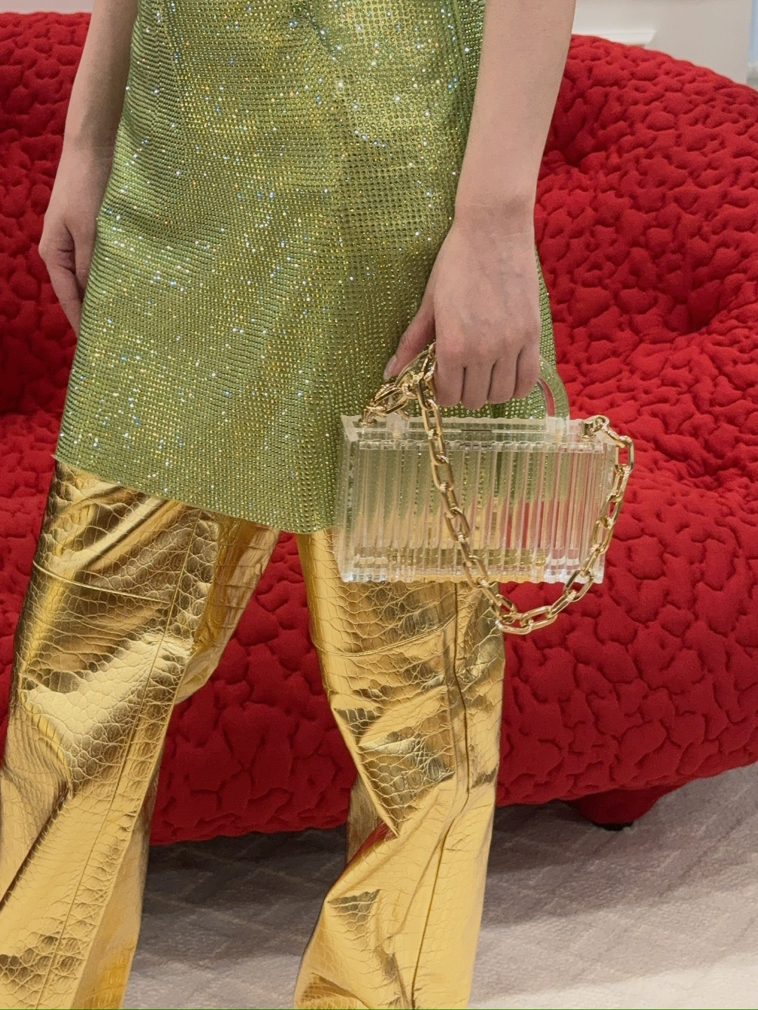 Get ready to steal the spotlight in the Killa Pants in Gold Croc. These high-waisted, straight-leg stunners in vegan croc-printed leather give you luxe vibes with adjustable length for that perfect fit. Whether you're going full glam with the matching Killa bandeau or keeping it casual, these pants will have you walking like you own the room.