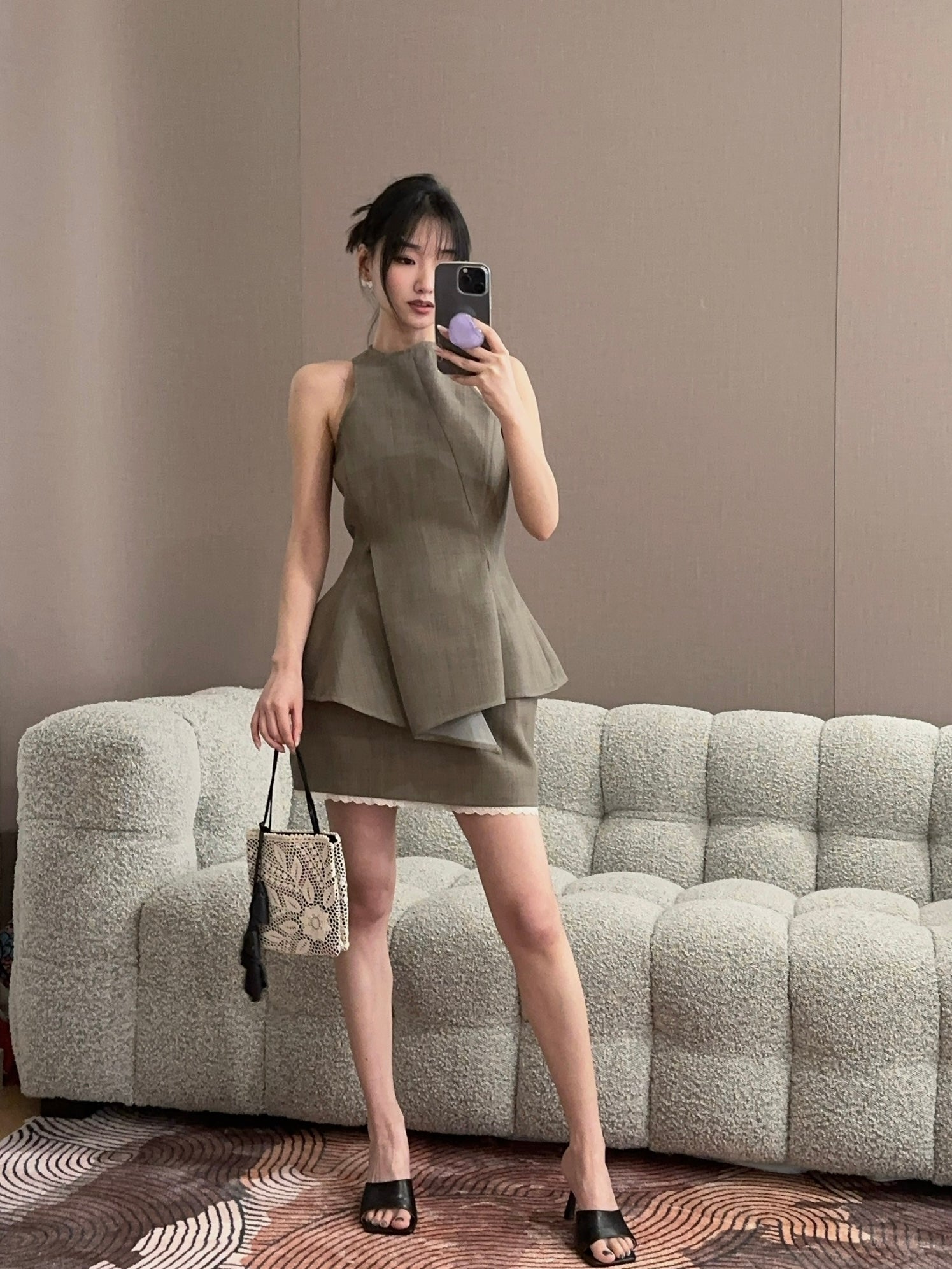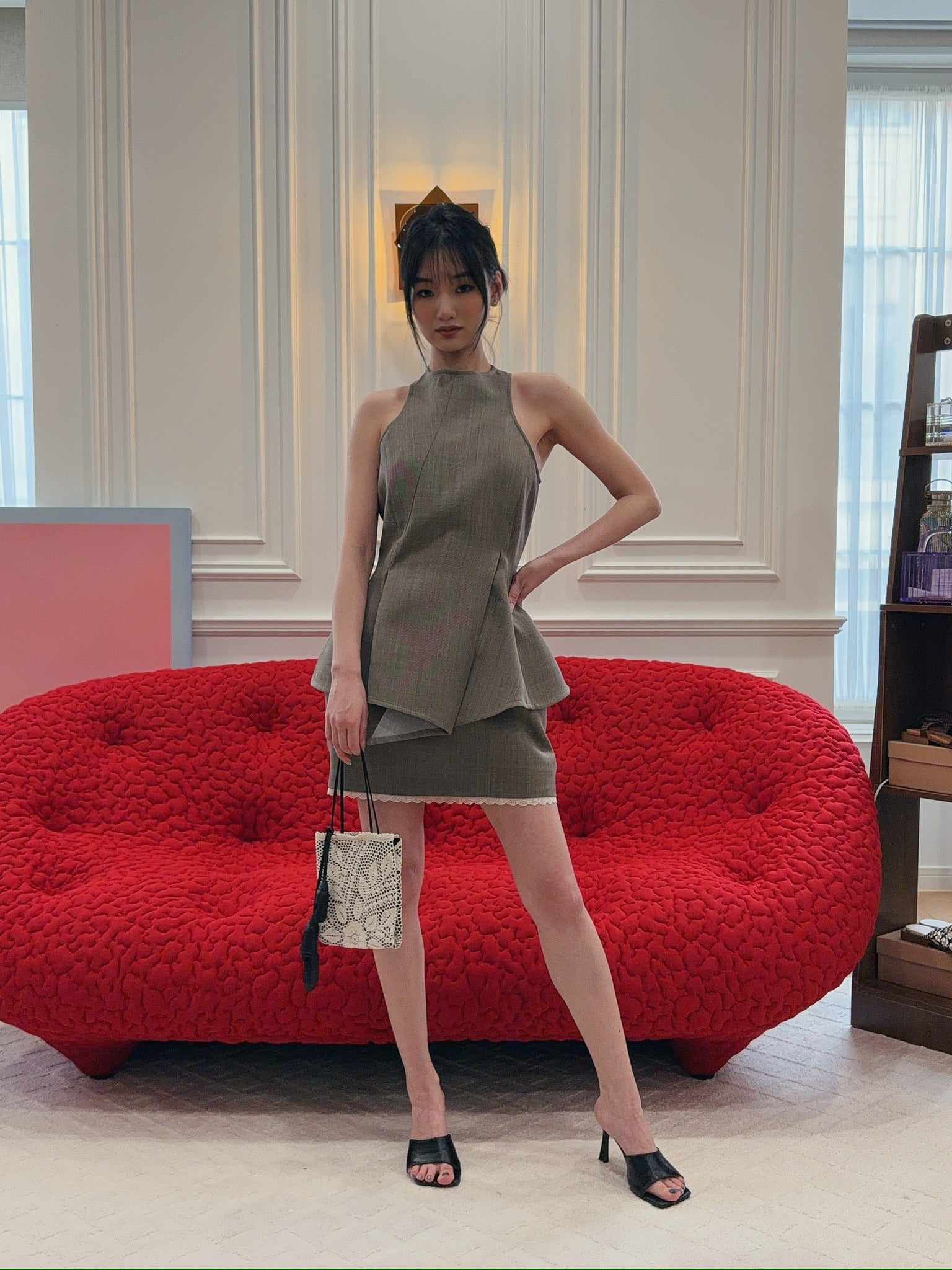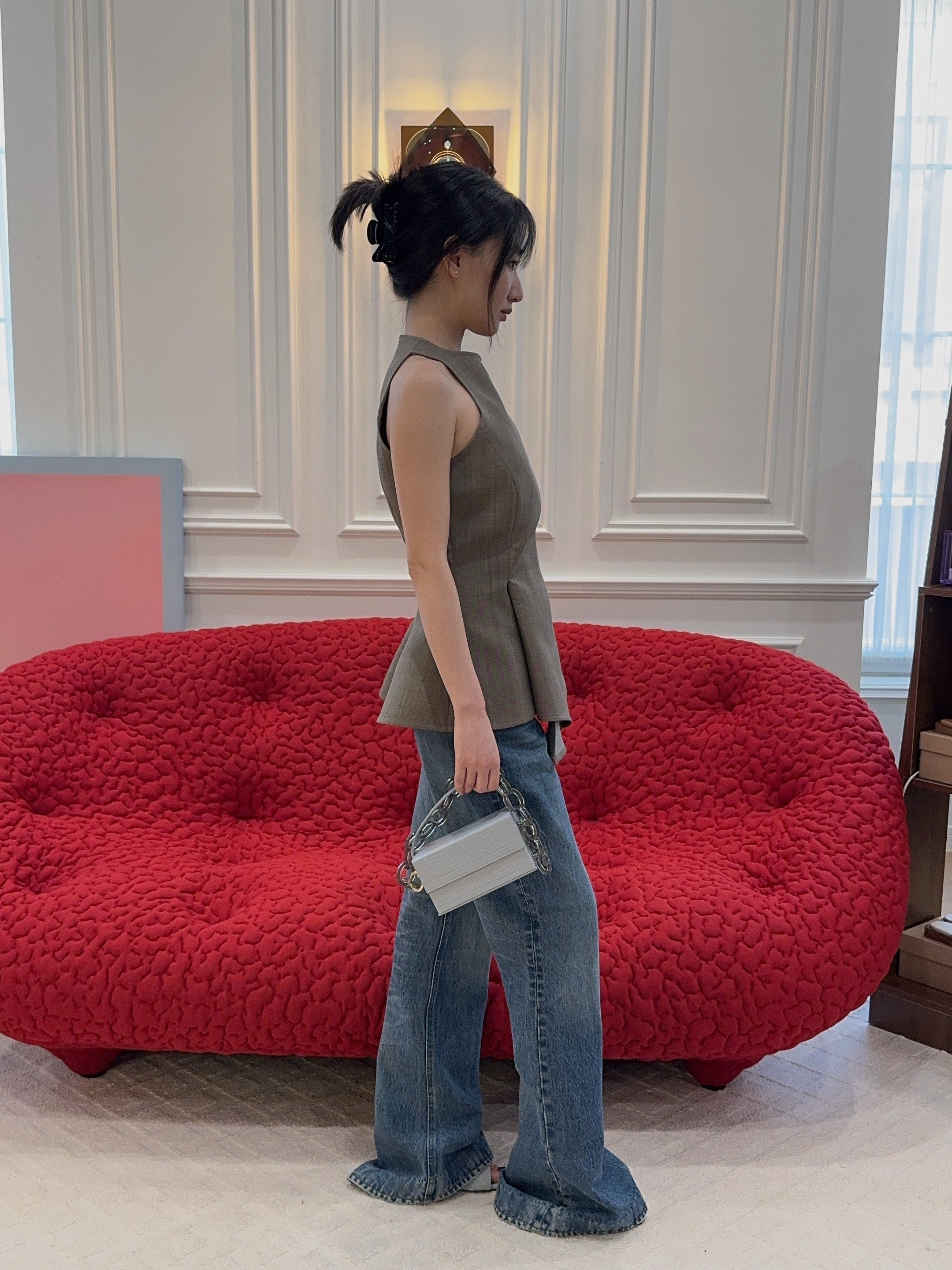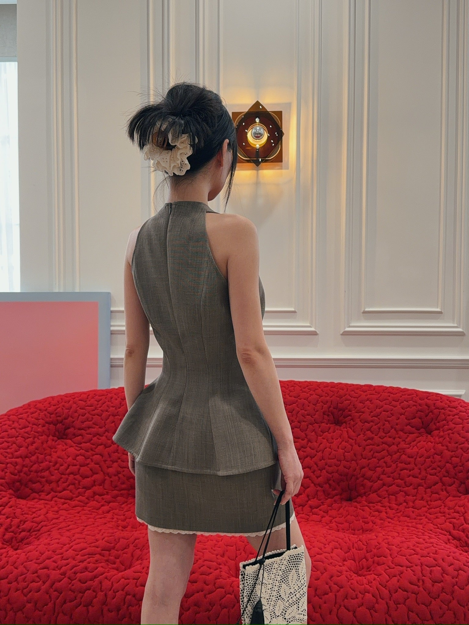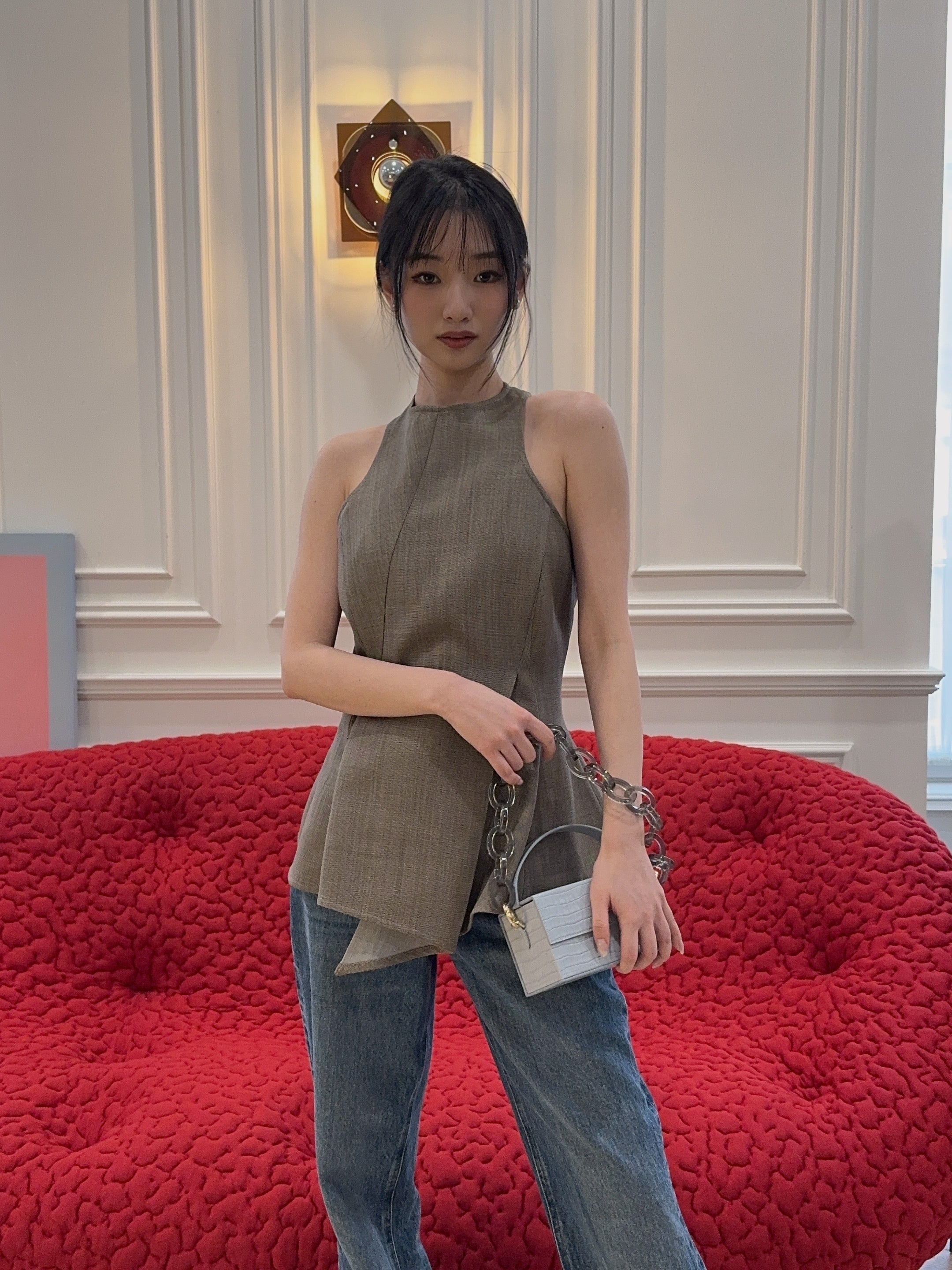 A sculptural sleeveless top crafted from fine wool. Designed with wide straps that sit close to the neck and sharply cut armholes to accentuate the shoulders. The front features deep darts and asymmetrical seams that create a draped, flared hemline. At the back, precise tailoring opens below the waist for added volume. Finished with piped seams and a concealed zip closure.