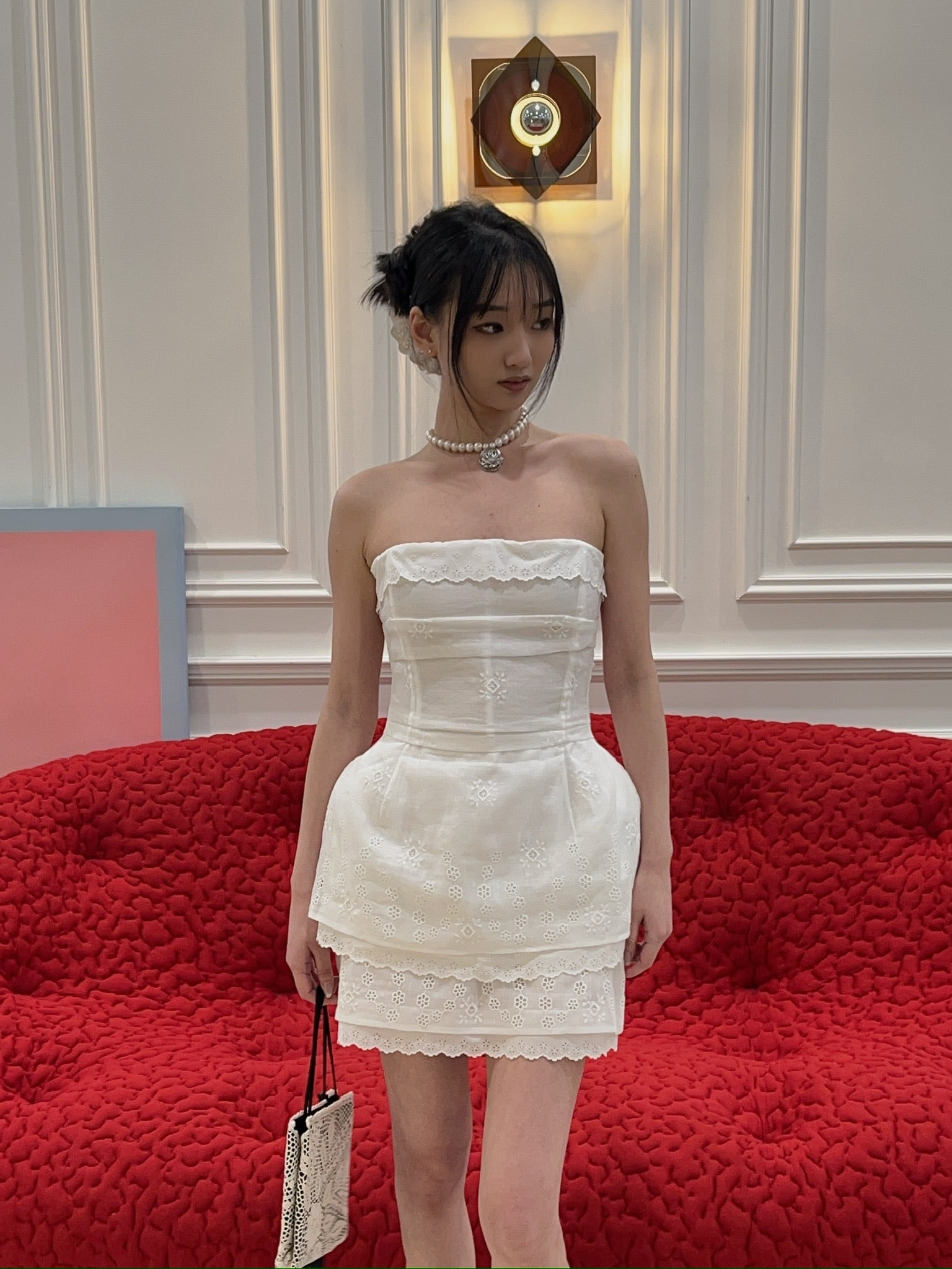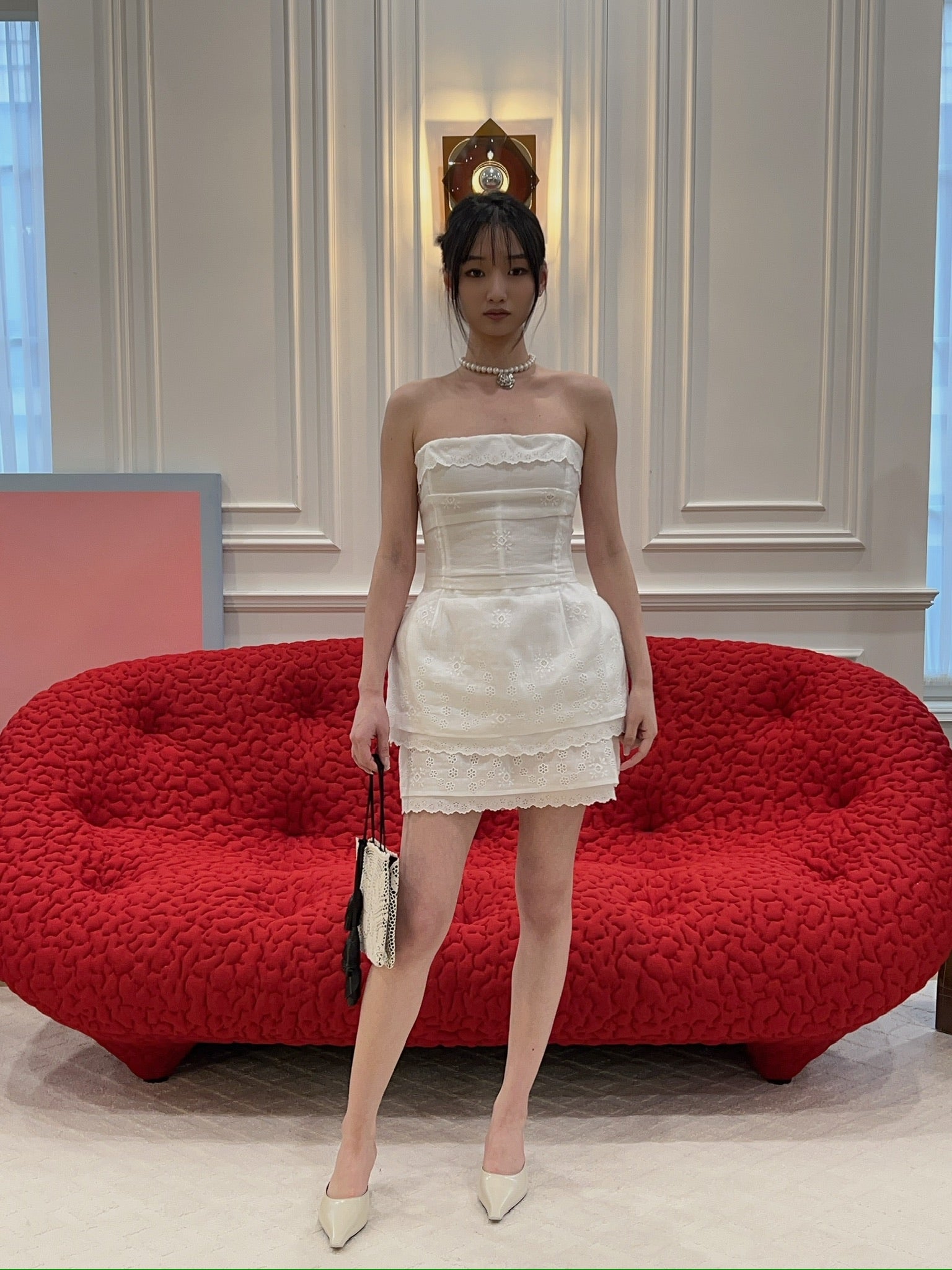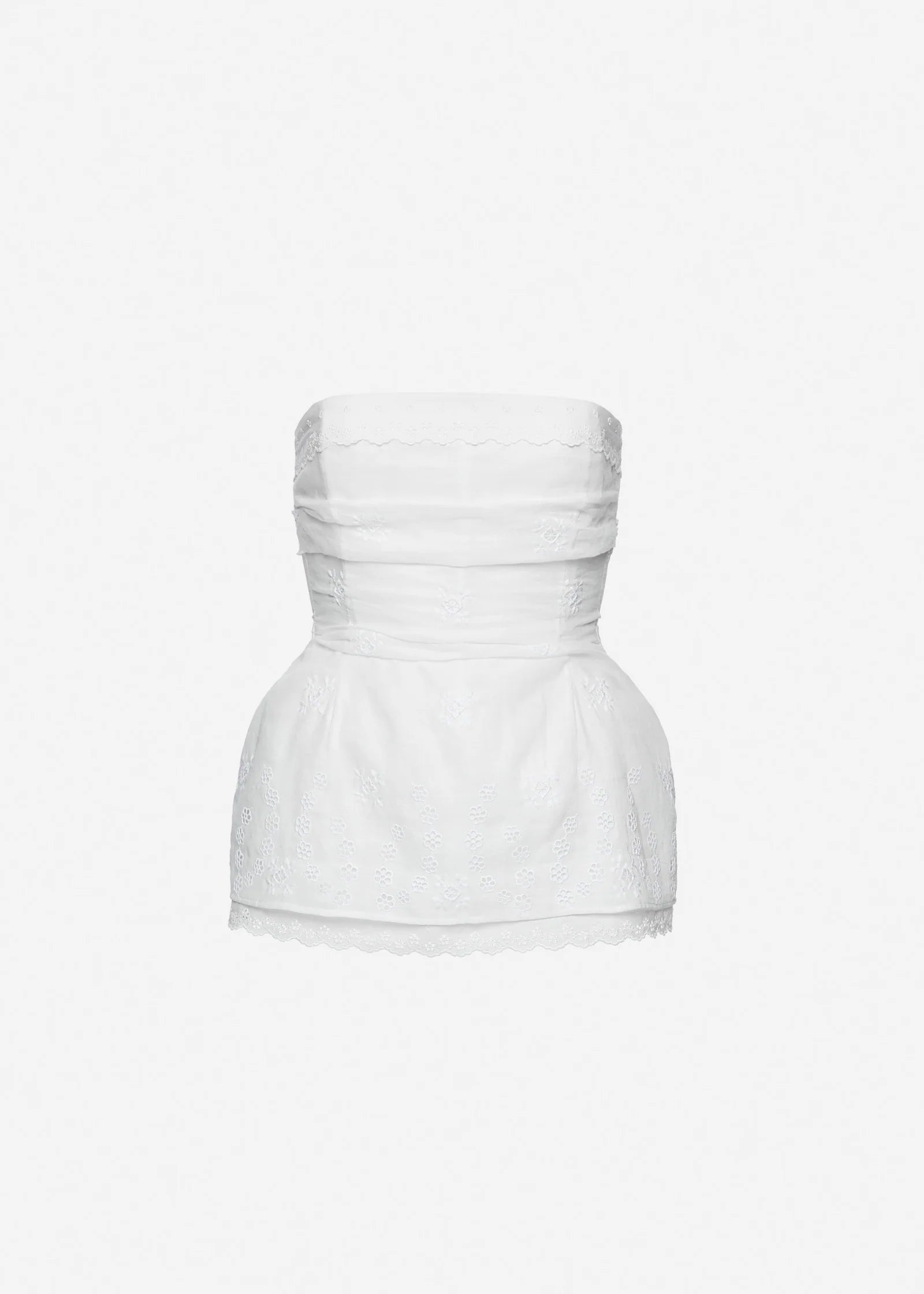 A corset crafted from embroidered cotton and linen fabric, detailed with delicate lace along the neckline and hem. The interior features a mesh corset base with hook closures for structured support. Designed to accentuate the waist and softly structure the hips with light padding. Closes at the back with a concealed separating zip. The lower edge of the lining is finished with visible decorative lace for a romantic touch.