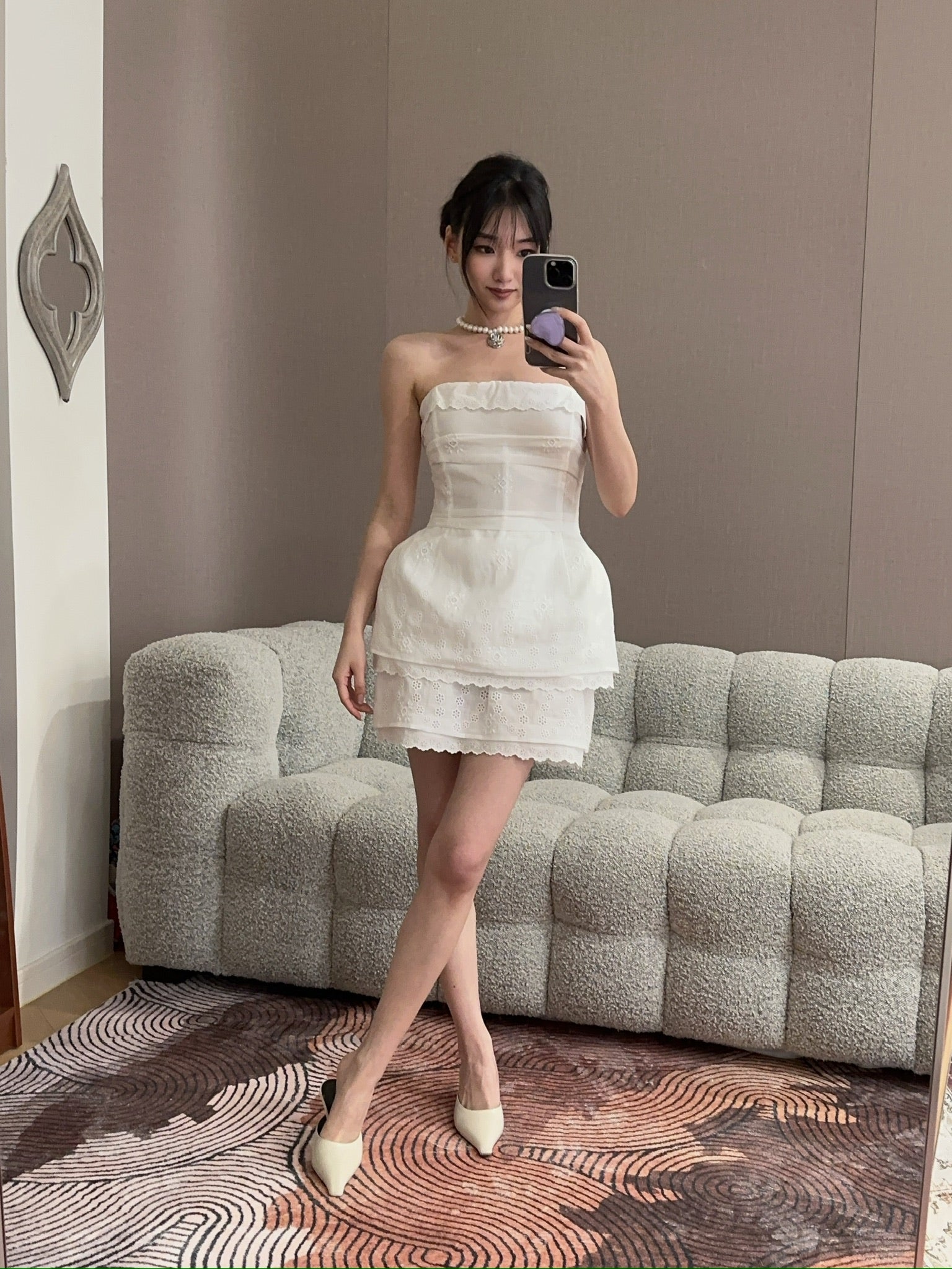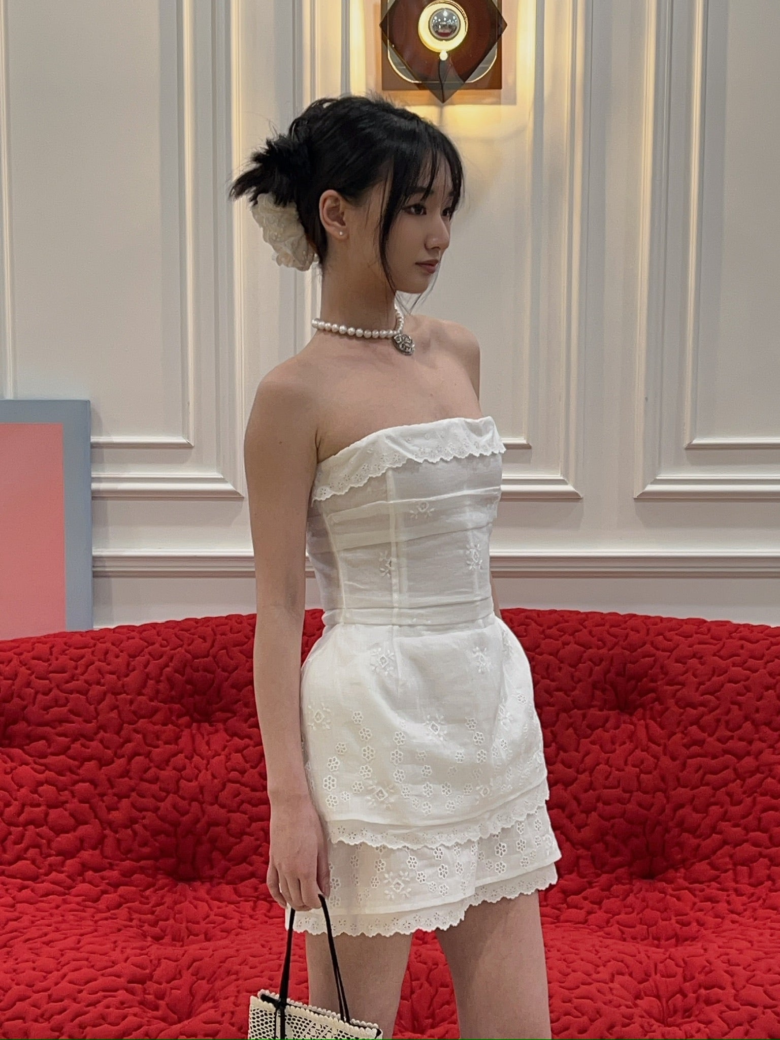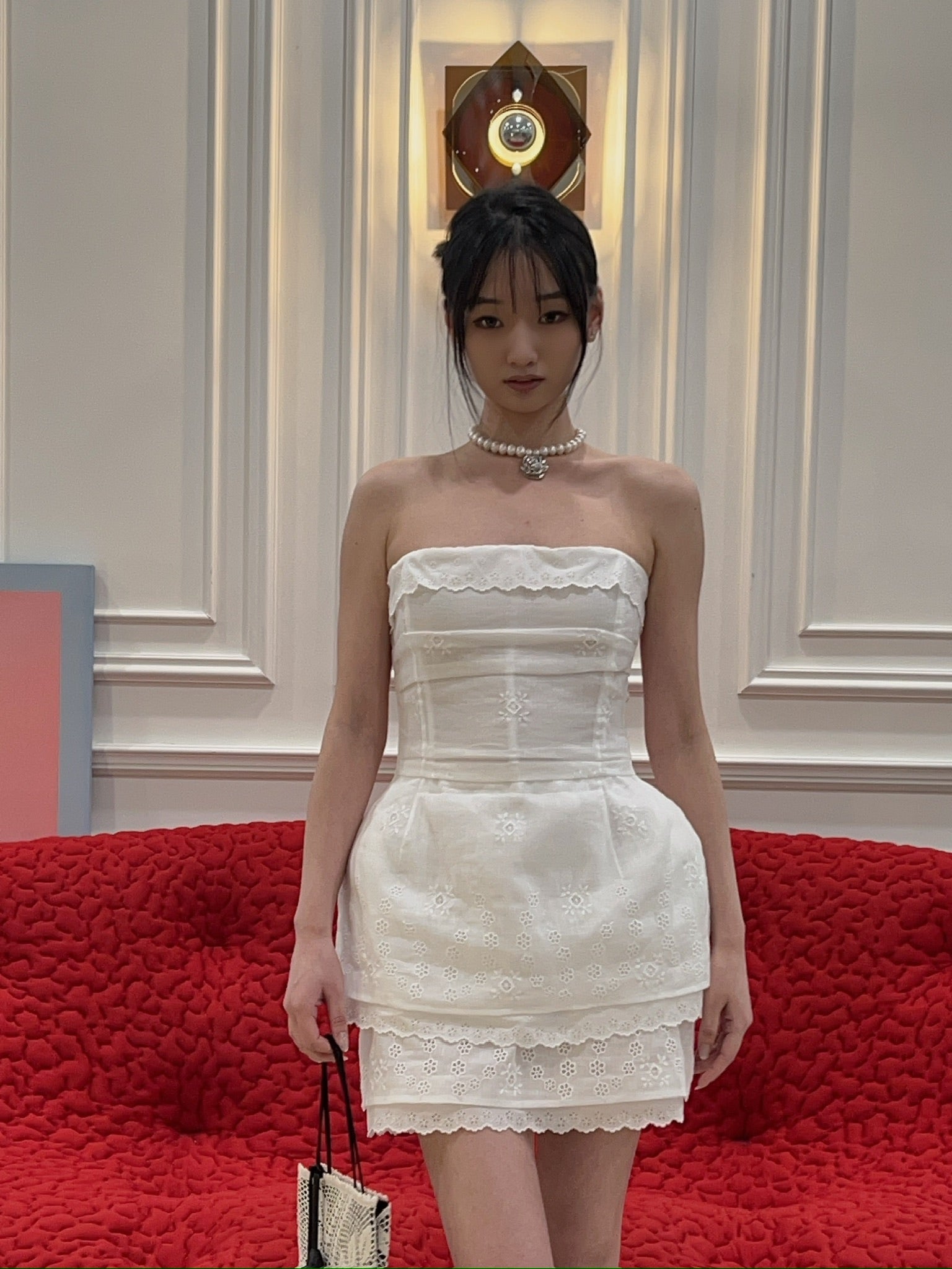 A corset crafted from embroidered cotton and linen fabric, detailed with delicate lace along the neckline and hem. The interior features a mesh corset base with hook closures for structured support. Designed to accentuate the waist and softly structure the hips with light padding. Closes at the back with a concealed separating zip. The lower edge of the lining is finished with visible decorative lace for a romantic touch.