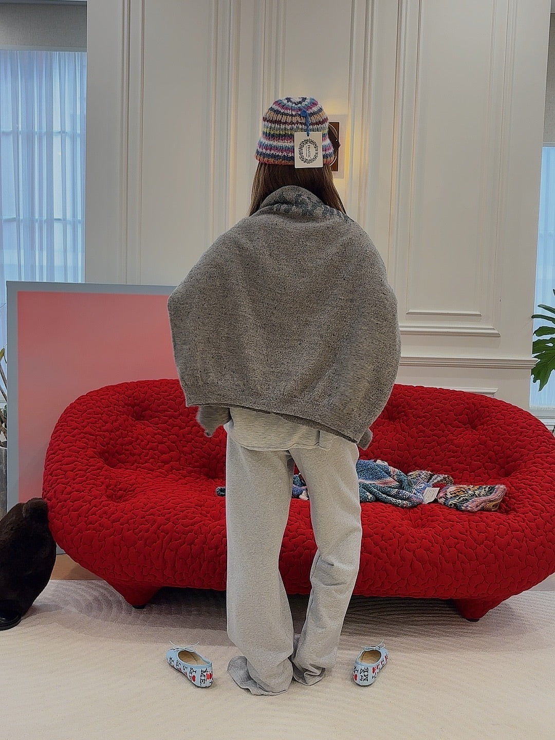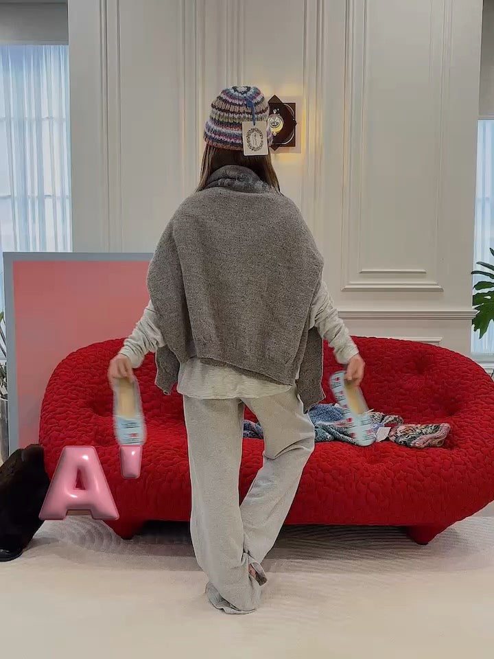 Taupe grey wool knitted construction mélange effect intarsia-knit logo lurex detailing ribbed trim V-neck front button fastening drop shoulder long sleeves two front patch pockets straight hem