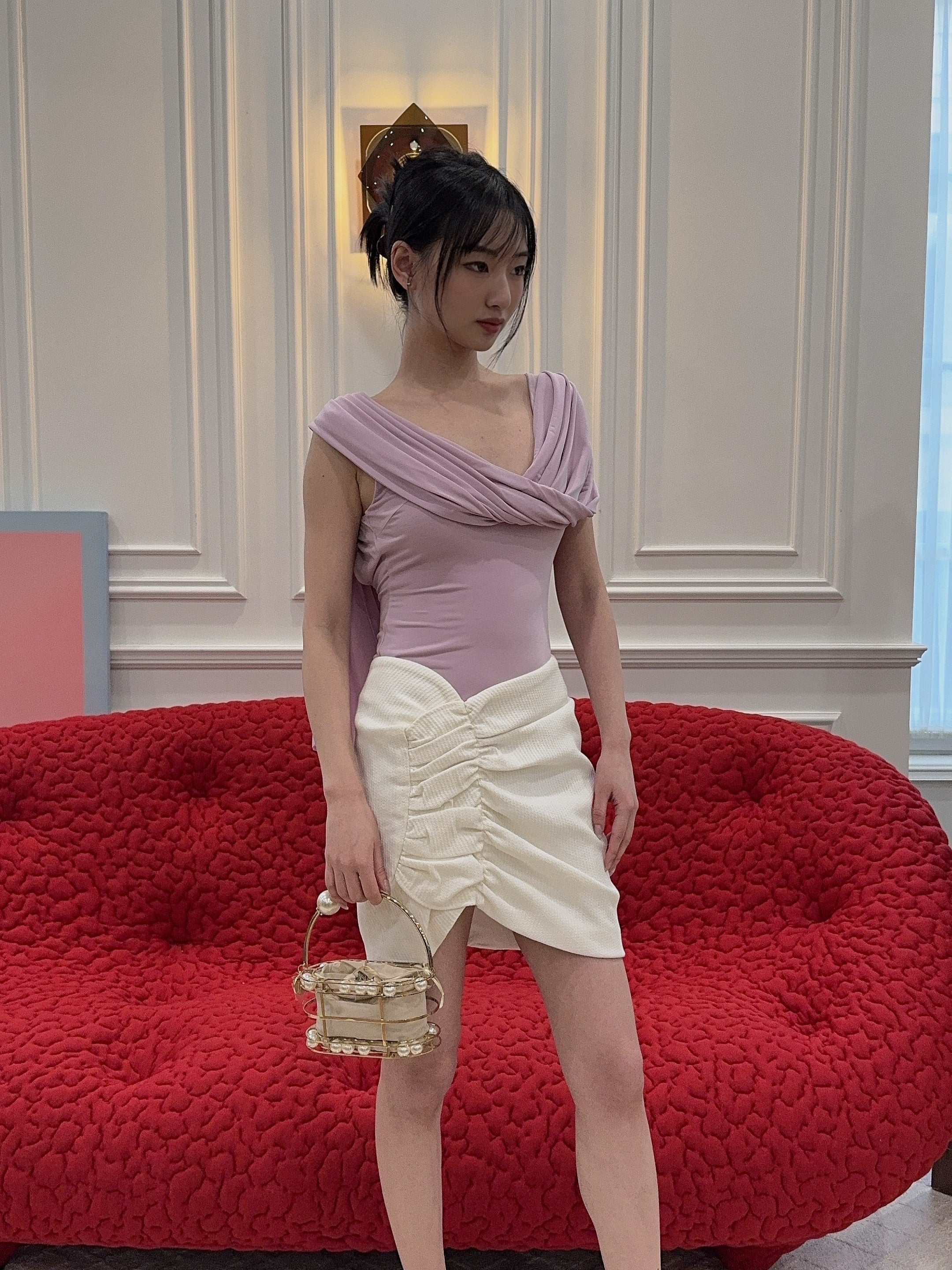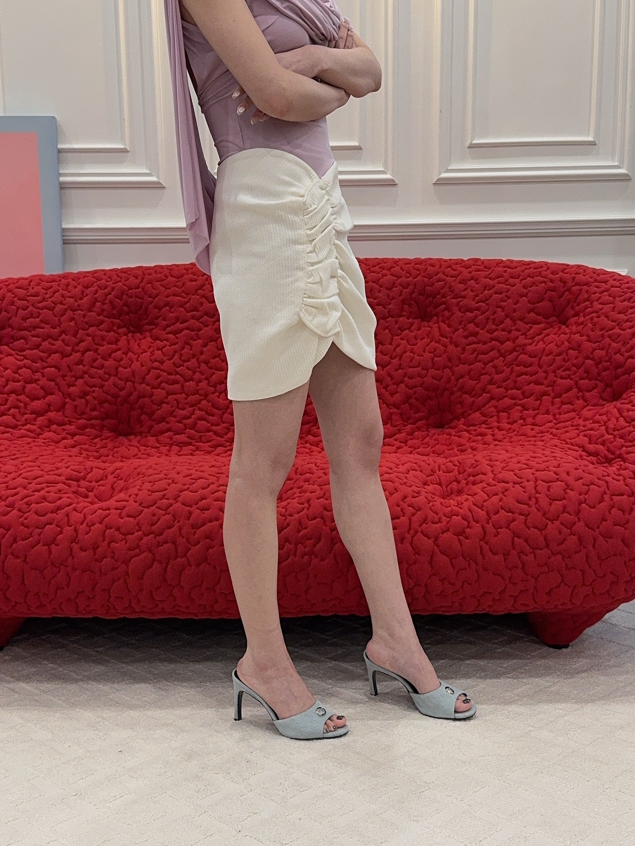 ruched asymmetric skirt from The Mannei featuring milk white, cotton blend, chenille texture, asymmetric design, ruched detailing, concealed rear fastening and full lining.