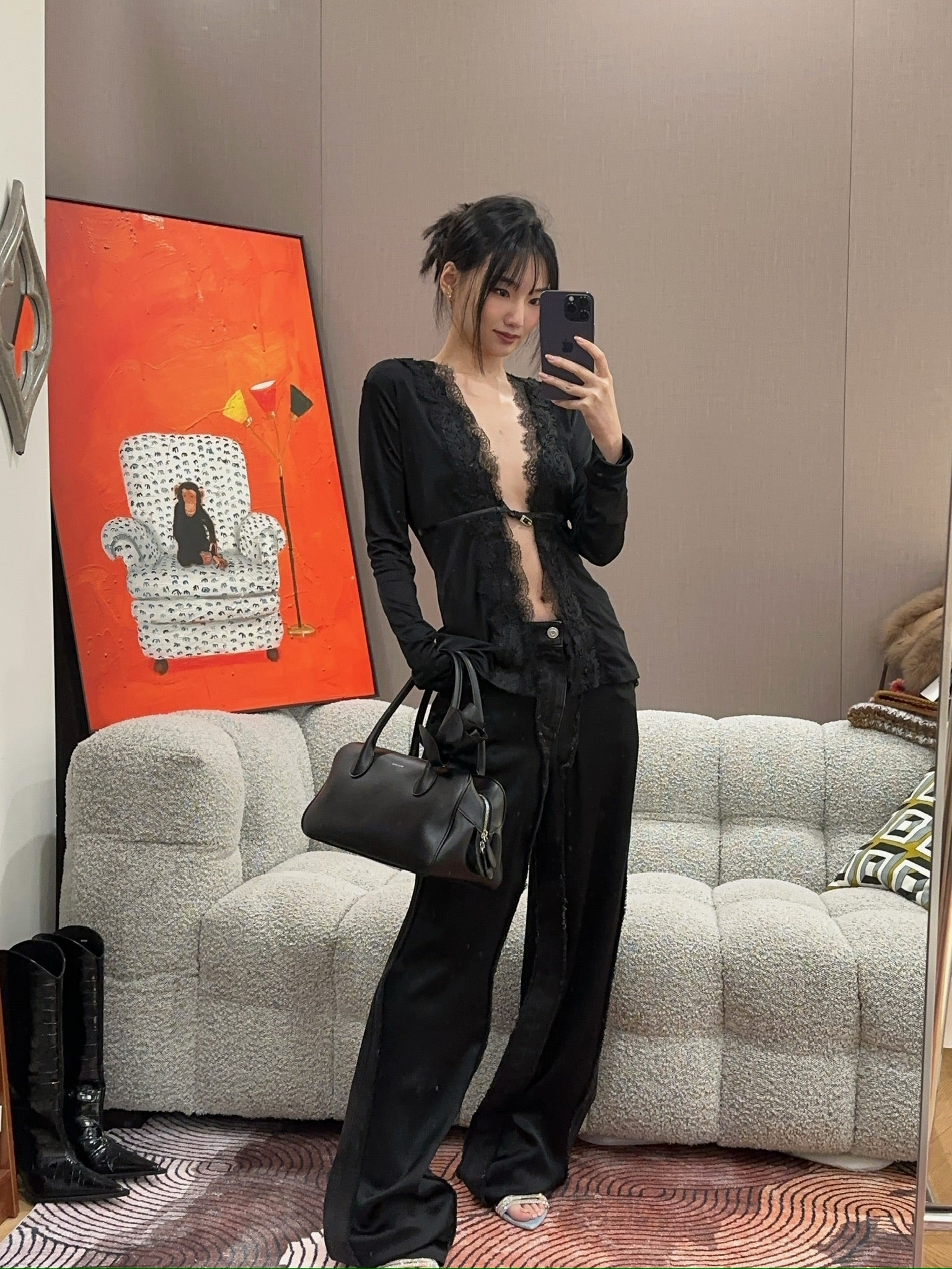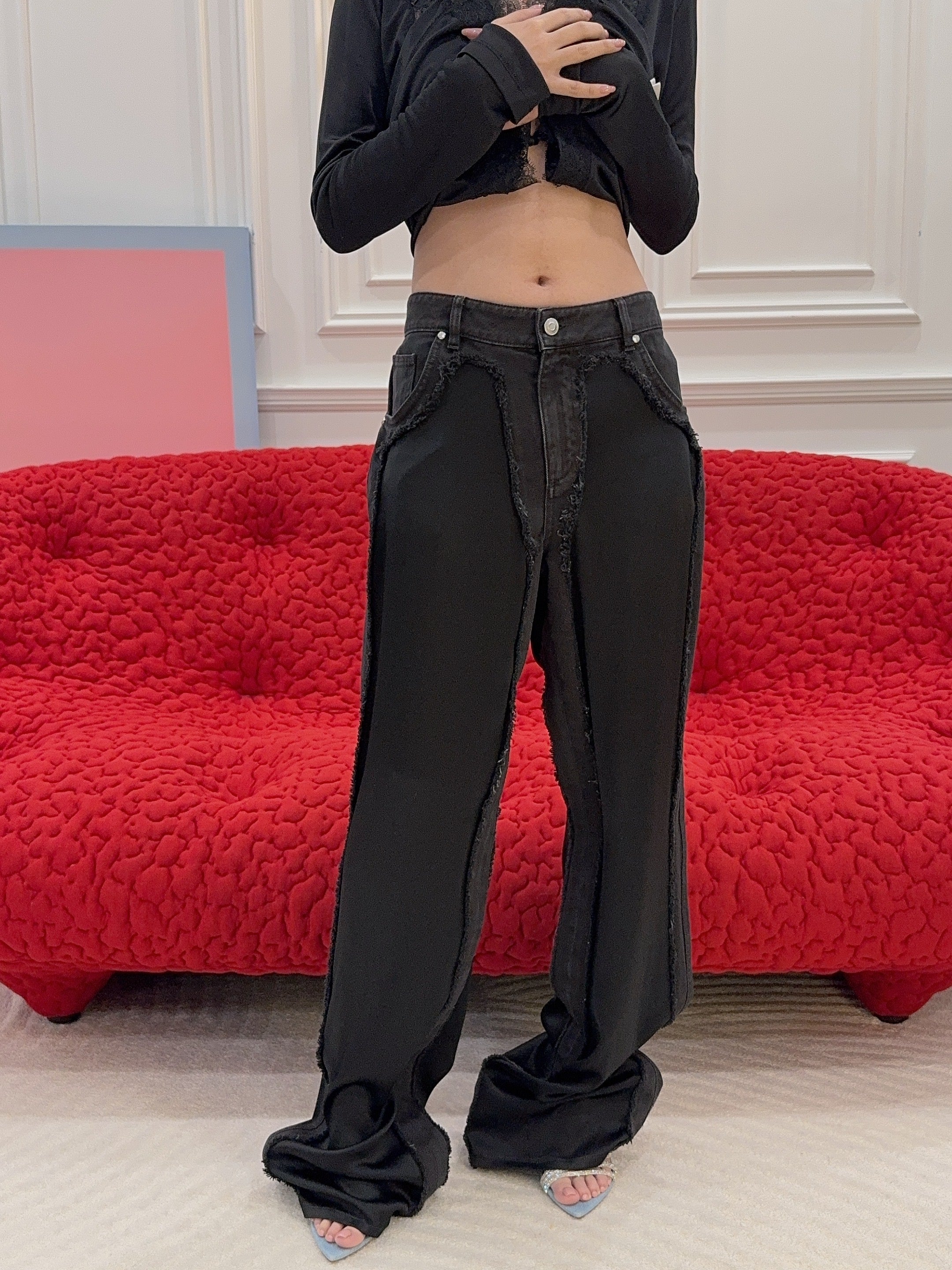 Satin Pants With Fringed Denim Inserts On The Top And Leg Sides.